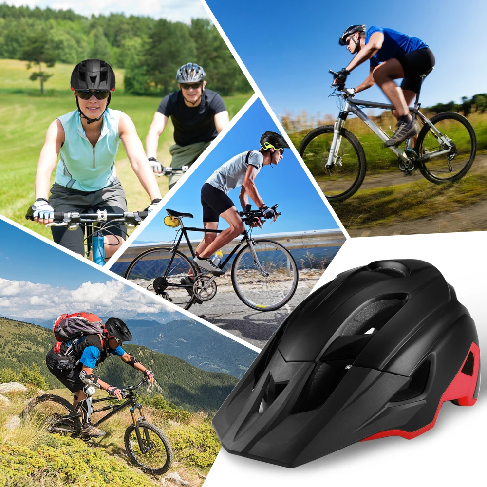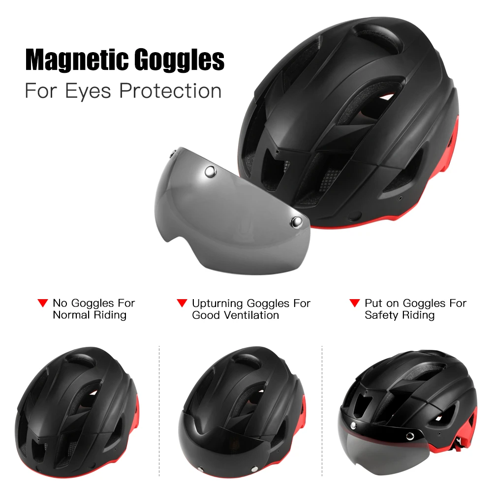 Ударопрочный жесткий корпус из поликарбоната с высокой плотностью EPS пены для защиты головы от непредвиденных травм, съемный козырек и съемные Магнитные очки являются УФ-защитой для предотвращения вредных солнечных лучей. Хороший велосипедный шлем для вашей поездки!