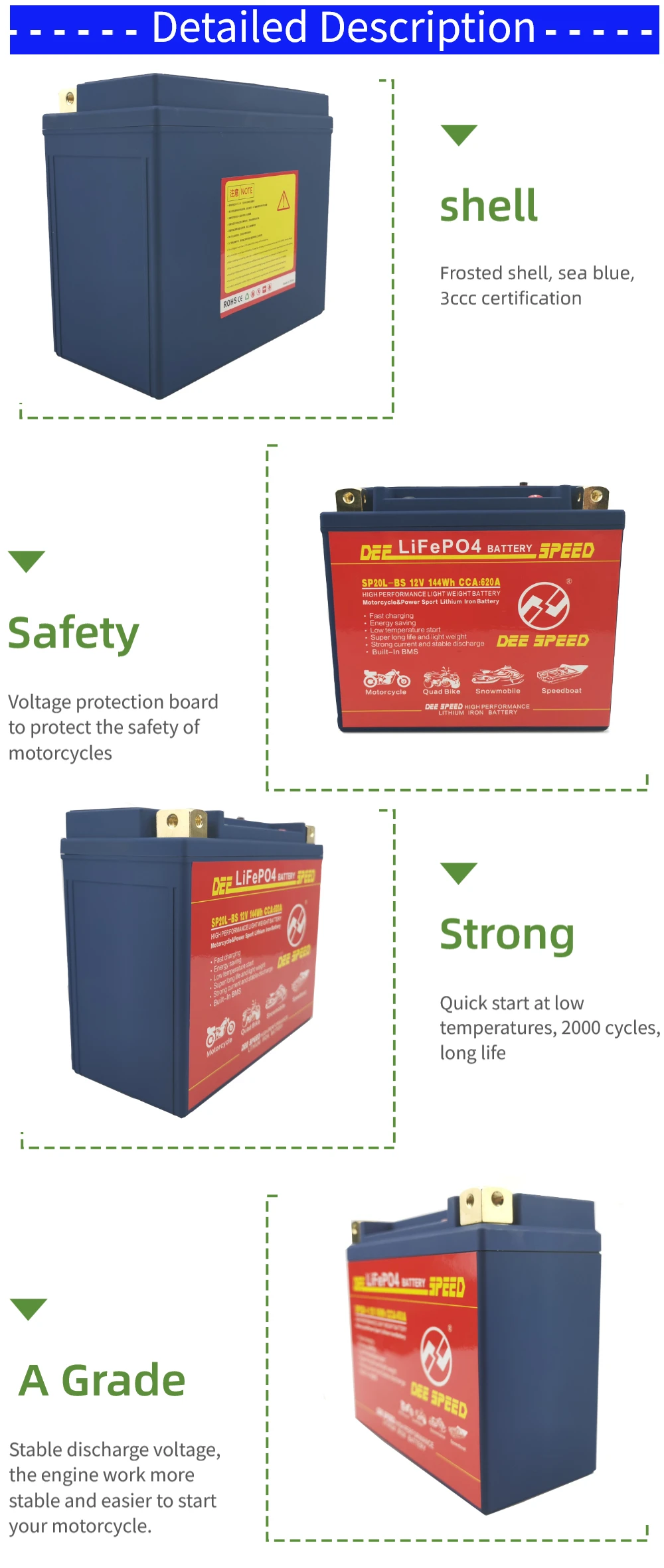Преимущества: он имеет отличную безопасность и высокую эффективность и стабильность производительности, чем традиционные свинцово-кислотные батареи Светильник вес: это только в том случае, 1/3 раз светильник er, чем свинцово-кислотных аккумуляторных батарей. Низкий уровень саморазряда: он может храниться более 1 года (и нормальная свинцовая кислота может храниться только менее 6 месяцев). Отсутствие загрязнения: он не содержит каких-либо опасных материалов, таких как тяжелые металлы, кислоты или любые провода и т. Д. Отличная большая производительность зарядки: он может принимать ток зарядки 10C и 90% будет заряжаться за 6 минут. Экономия топлива: увеличение входного напряжения, повышение эффективности свечей зажигания, что позволяет экономить топливо для ваших автомобилей Длительный срок службы: как правило, срок службы нашей батареи может достигать более 2000 раз с емкостью 80% (свинцово-кислотная батарея noral имеет срок службы всего в 300 раз). Внимание: перед установкой проверьте правильность выпрямителя. Литиево-ионный аккумулятор для мотоцикла имеет следующие преимущества: 1) светильник вес, запуска для традиционных свинцово-кислотная батарея Вес около одной трети; 2) Экологическая защита, отсутствие серной кислоты, тяжелых металлов, таких как свинец, кадмий и ртутное загрязнение; 3) не нужно добавлять кислоту, полностью бесплатное обслуживание, отсутствие проблемы с утечкой кислоты, может быть установлен в любом направлении для использования, безопасный и надежный; 4) Высокая мощность, пусковой ток составляет более 40 с (отношение начала свинцово-кислотного пуска 10 с); 5) ЗАРЯДНАЯ способность сильна, может быть большой ток быстрой зарядки, самый быстрый может зарядить аккумулятор 10 с, 6 минут можно зарядить до 90% емкости. Даже после потери электричества, можно заполнить в течение короткого времени. 6) сверхдлительный срок службы, может быть больше 2000 раз (свинцово-кислотная батарея обычно 300); 7) Низкий саморазряд, длительное время хранения и может быть более 1 года. 8) стабильное напряжение разряда, двигатель работает более стабильно и проще, чтобы начать ваш мотоцикл.