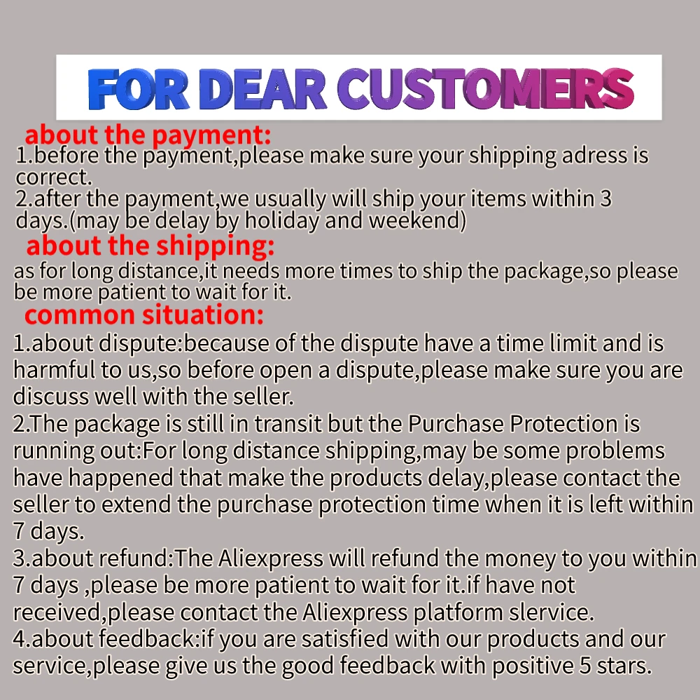 Если вы удовлетворены нашей работой и продуктами, пожалуйста, оставьте нам пять звезд, отзывы и расскажите своим друзьям; Если нет, пожалуйста, свяжитесь с нами, прежде чем оставлять негативные отзывы. Мы можем работать вместе, чтобы разрешить любой спор. Ваше удовлетворение является нашим главным приоритетом. Добро пожаловать в наш магазин!