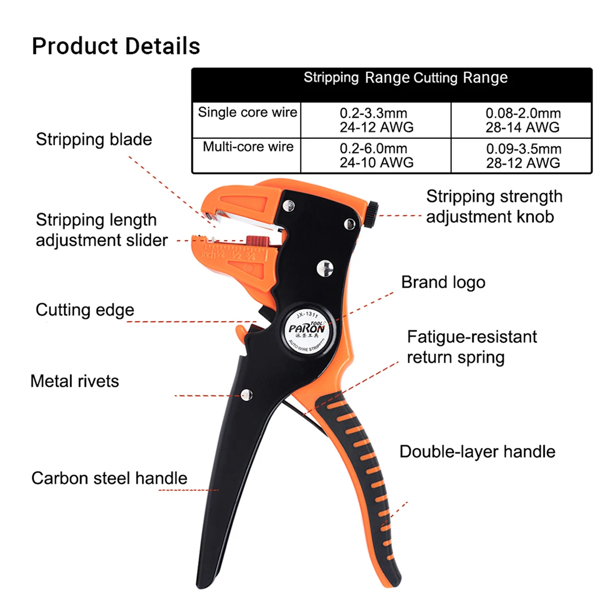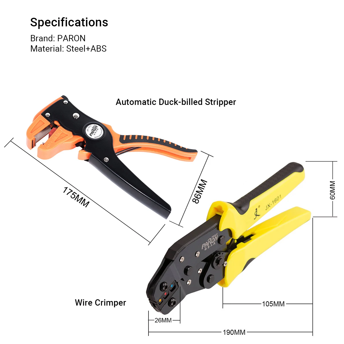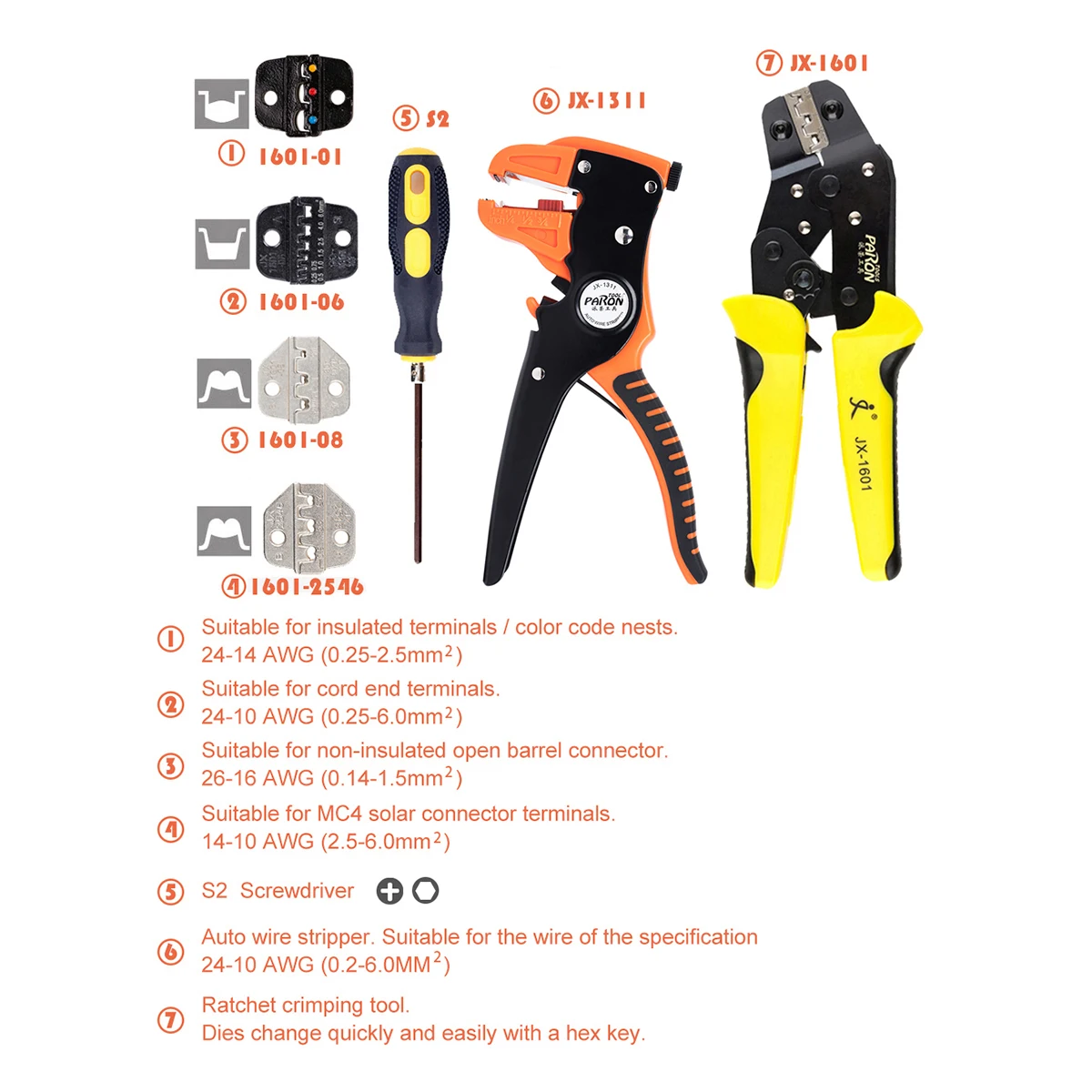 Бренд: PARON Модель: JX-D4311 Материал: сталь 50 # Цвет: как показано на изображениях Подходящие клеммы и Диапазон обжима проводов: -Гнезда цветного кода/Изолированные клеммы 24-14 AWG (0,25-2,5 мм ²). -Наконечники шнура 24-10 AWG (0,25-6,0 мм ²). -Неизолированный открытый Цилиндрический разъем 26-16 AWG (0,14-1,5 мм ²). -Разъем MC4 на солнечной батарее 14-10 AWG (2,5-6,0 мм ²). Диапазон зачистки: Одножильный провод: 0,2-3,3 мм ² 24-12 AWG Многожильный провод: 0,2-6,0 мм ² 24-10 AWG Диапазон резки: Одножильный провод: 0,08-2.0мм ² 28-14 AWG Многожильный провод: 0,09-3,5 мм ² 28-12 AWG Размер проволоки: прибл. 190*60*26 мм/7,48*2,36 * 1.02in Вес щипцы для проволоки: прибл. 321 г/11,32 унций Размер зачистки проводов: прибл. 175*86*13 мм/6,89*3,39 * 0.51in Вес зачистки проводов: прибл. 193 г/6,81 унций Размер посылка: прибл. 285*145*55 мм/11,22*5,71*2,17 дюймов Вес посылка: прибл. 853 г/30,09 унций