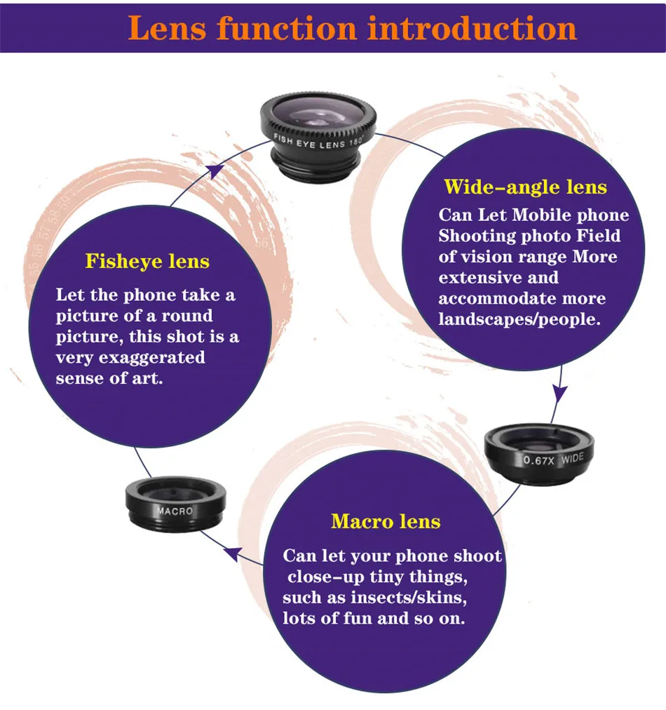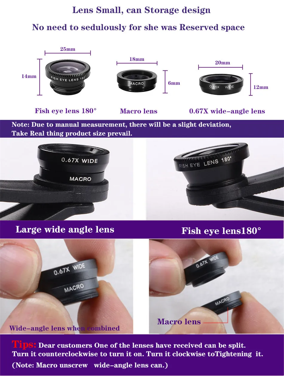 Если у вас есть какие-либо вопросы после получения продукта, вы можете связаться с нами в любое время, мы надеемся, что вы это сделаете Не начинайте спор сразу или не оставляйте плохой отзыв. Потому что спор наносит нам много вреда, Мы обещали предложить вам идеальное решение. Пожалуйста, примите во внимание заранее спасибо! Описание товара: Портативный и легкий дизайн Универсальный зажим 3-в-1: широкоугольный, макрообъектив, объектив рыбий глаз Макрообъектив может делать четкие фотографии небольших объектов Широкоугольный объектив может записывать широкий спектр пейзажей 180 градусов сцены могут быть сняты с линзами рыбий глаз, что позволяет наслаждаться нереальным Мир. Чтобы использовать этот объектив, вы можете легко наслаждаться фотографией и находить мгновенную красоту мира, Действительно удовлетворяет потребности фотографов. Подходит для объектива на рынке 99% мобильный телефон (подходит для iPhone, iPad, Sumsang,HTC, И других смартфонов)