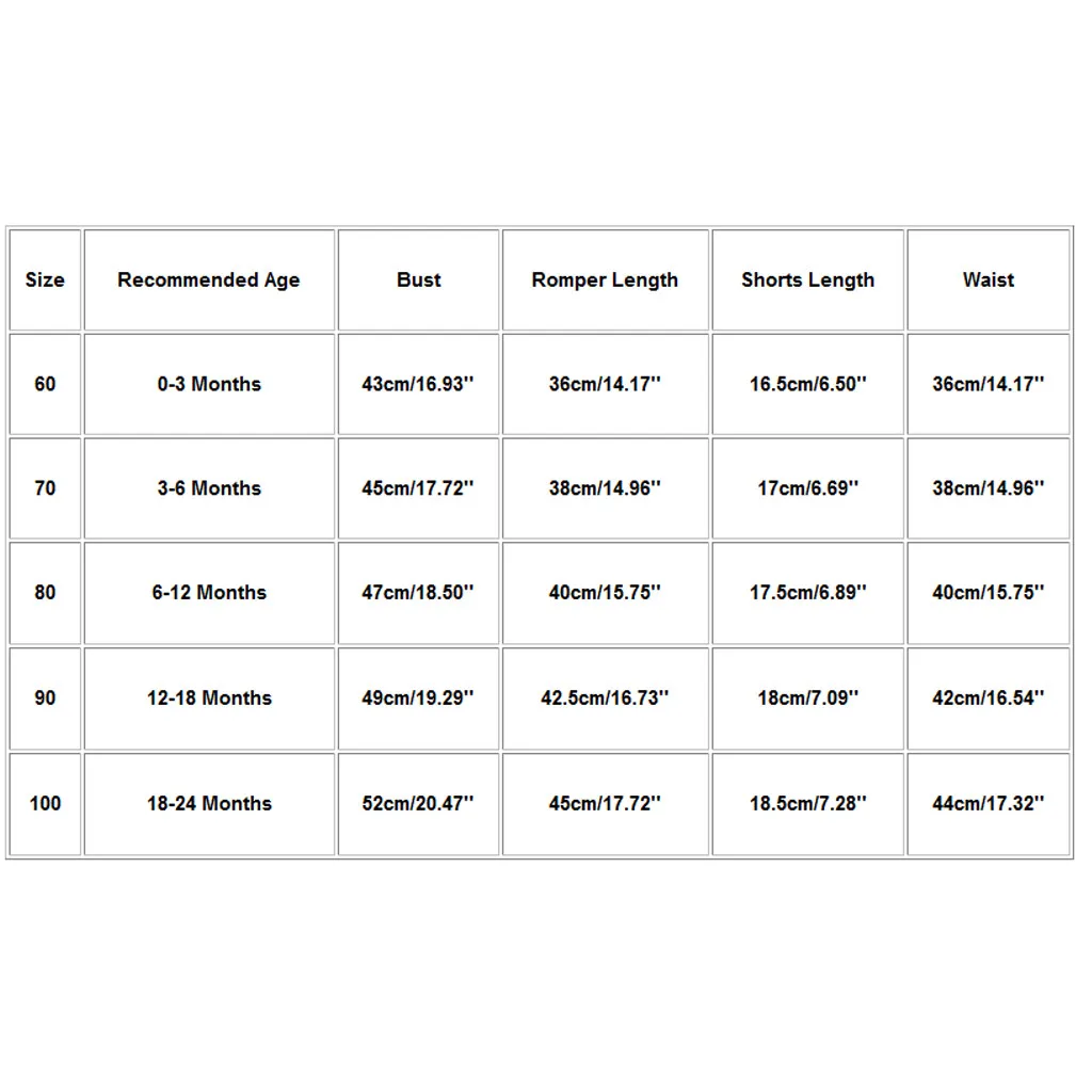 Size Recommended Age Bust Romper Length Shorts Length Waist 60 0-3 Months 43cm/16.93'' 36cm/14.17'' 16.5cm/6.50'' 36cm/14.17'' 70 3-6 Months 45cm/17.72'' 38cm/14.96'' 17cm/6.69'' 38cm/14.96'' 80 6-12 Months 47cm/18.50'' 40cm/15.75'' 17.5cm/6.89'' 40cm/15.75'' 90 12-18 Months 49cm/19.29'' 42.5cm/16.73'' 18cm/7.09'' 42cm/16.54'' 100 18-24 Months 52cm/20.47'' 45cm/17.72'' 18.5cm/7.28'' 44cm/17.32''