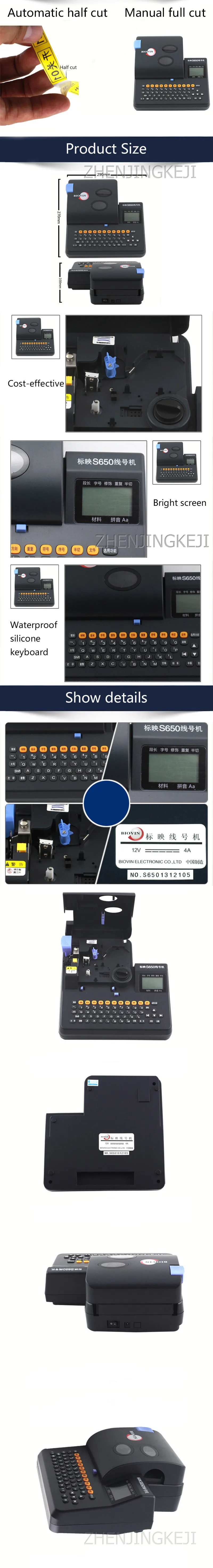 Название продукта: принтер этикеток кабеля Модель продукта: S650 Рукава печати секций: 35 секций 20 мм/мин Сегменты печати наклеек: 40 сегментов 20 мм/мин Вес изделия: 3 кг Метод печати: термопечать Ширина печати: 6. 9. 12 мм Разрешение: 300 точек/дюйм Выбор размера шрифта: 6 размеров Метод резки: Автоматическая половина резки, ручная полная резка Клавиатура: гуманизированная Водонепроницаемая силиконовая клавиатура Мощность: 12 В постоянного тока 3.5A Дисплей: ЖК-белая подсветка; Двойной линейный дисплей Метод ввода: поставляется с китайской клавиатурой Объем памяти: 1 г памяти, может хранить до 128 файлов