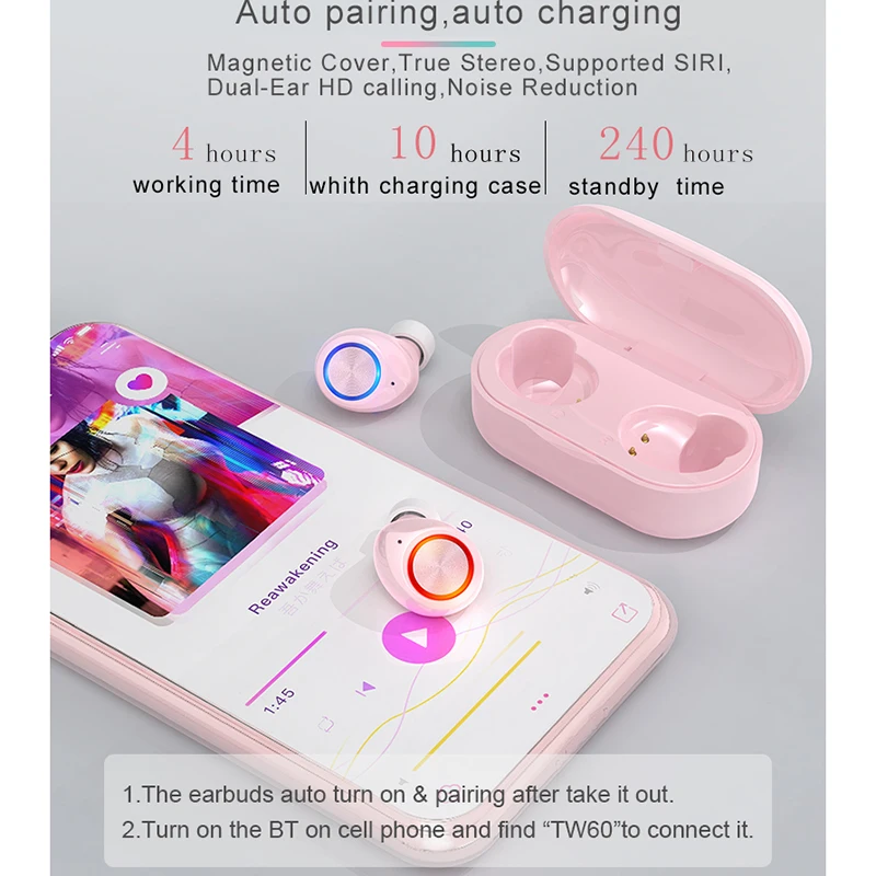 Основная информация: Номер товара: TW60 Цвет: черный, белый, зеленый, розовый, желтый Характеристики: Версия Bluetooth: V5.0 Профили поддержки: HSP, HFP, A2DP, AVRCP. Профиль и расширенный профиль распределения звука (A2DP) Рабочее расстояние: 10 м; Мощность передачи: класс 2 Частотный диапазон: 2,4026 GHz2.480 ГГц Сопротивление: 32 Ом Чувствительность: 105 дБ + / - 3 дБ Емкость аккумулятора наушников: 40 мАч * 2 Емкость аккумулятора зарядного устройства: 400 мАч Посылка тация: 1 наушник TW60 1 * Руководство пользователя на английском языке 1 * зарядная коробка 1 * зарядный кабель Micro USB 1 Запасные беруши