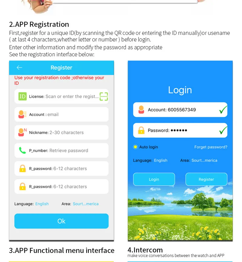 Note: Before order this watch, please make sure your country supports 2G networks. We can't accept bad feedback for this reason. The system language of the watch is English or Russian. The APP language of the watch supports the language of most countries. In order to prevent the child from shutting down, the watch will not be able to shut down after inserting the SIM card. Please remotely control the shutdown through the APP. (If forced shutdown is required, please press the switch at least 8 times in succession, or take out the SIM card then turn it off) Feature 🎁Birthday’s gift for kids, Kids Smartwatch, The best gifts to show you love. It will bring a lot of happiness for the kids.It will be the best gift for you lovely little angle's birthday. ✨2019 Kids Smartwatch Waterproof function including :LBS, Waterproof, Camera, Two-way call, SOS emergency call, Clock, Game, etc. 🆘SOS Emergency Call:When in distress, Kids can press the SOS key for 3 seconds to circularly call families' numbers for help.You can set up to 3 SOS numbers.Great help for kids in emergency situation! 🚩AGPS+LBS Position:Double position technology based on AGPS,Location Base on Cell Tower Station means double safety for kids. Realize all-day real-time location tracking, more accurate positioning, children just click SOS to connect the phone, At the same time, parents can check the location anytime, anywhere by SMS, iOS or Android APP. 🎁WARRANTY&SUPPORT:: Please feel free to contact us, we will provide you with a one-year warranty. If you meet some problem in setting the watch. Please contact us before returning it back. We will make a reply in 24 hours to help you to solve the problem. 🔅Q:How to set it up? A:1. Choose a SIM Card: You need to choose a micro sim card supports GSM network(not CDMA). Open 2G digital service and caller ID service. In US. We recommend T-Mobile. 2. download the application SeTracker or SeTracker2. 3. Register with the registration ID on the back cover of the watch. 4. Log in and get all the features. 🔅 Install the Setracker App. And then scan the QR code behind the watch to register an account. If you can't register it .Then please provide the IMEI number to us , we will help you register it successfully. 🔅 How to solve "device offline" problem? 1.Check whether there are signal bars and "↑↓" symbol on the watch. 2.If there is no signal bars, please check whether the sim was inserted correctly, and go to a good signal place and check it. 3.If there is no "↑↓" symbol, please open the data and voice plan for the sim card. 4.If there are signal bars and "📶" mark, But watch still was showing offline even though ▲NOTE:The first important thing to do was to check the watch settings by sending it a text message as follows: pw,123456,ts# A few moments later you got a text message back from the watch that showed it had an incorrect IP addres setting. This was resolved by sending the watch another text message as follows pw,123456,imsi# At this point the app started working with the watch. If there are still problems,Please feel free to contact us and send the text messages' screenshots to me, I'll try to help you solve the problem. Package List 1 x Kids Waterproof Smartwatch (not include sim card) 1 x USB Cable 1 x Kids watch quick start guide 1 x Screwdriver 1 x Spare screws