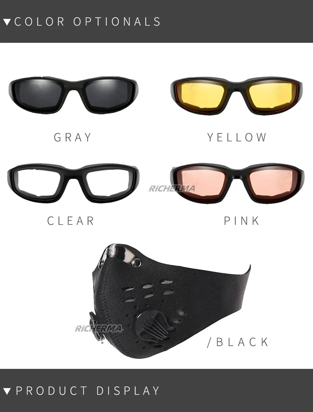 Тип товара:Мотоциклетная маска для лицаПол:Унисекс, мужчины, мужчины, женщины, женщиныПосылка:Очки + маска для ртаХарактеристика:Защита глаз, Защита лицаЦвет оправы:ЧерныйЦвет линзы:Желтый, серый, прозрачный, розовыйОсобенности:Дышащий, пыленепроницаемый, регулируемый, ветрозащитный, антибликовый, антиуфПрименение для:Мотоцикл, Байкерская езда, езда на велосипеде, лыжи, гонки на мотоцикле, беговые езды