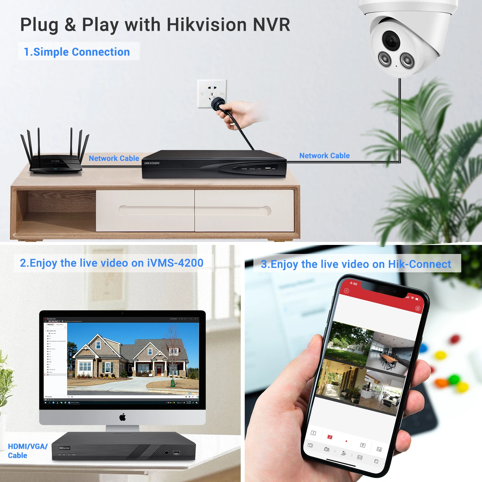 Compatible, can plug & play with Hikvision NVR, support most of the other brands NVR that support on-vif protocol,and the camera can be worked with most of security monitor software, like
