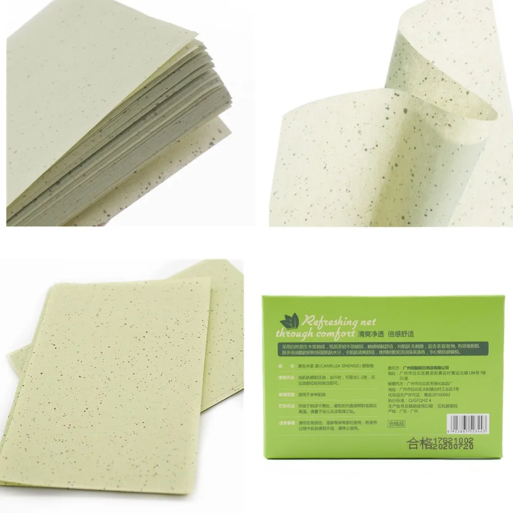 1. Материал: бумага для поглощения масла 2. Ингредиент: натуральный растительный зеленый чай 3. Спецификация; 100 шт. 4. Срок годности: 3 года 5. Функция: поглощение масла, поглощение потаХарактеристика: