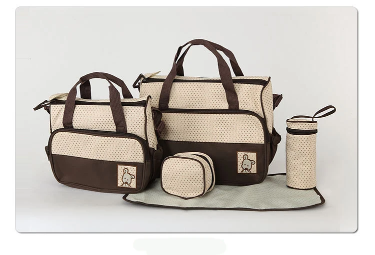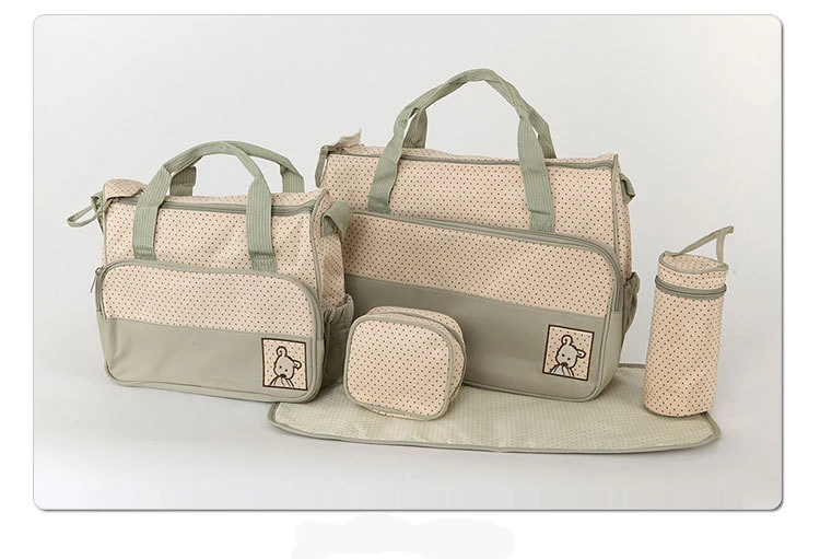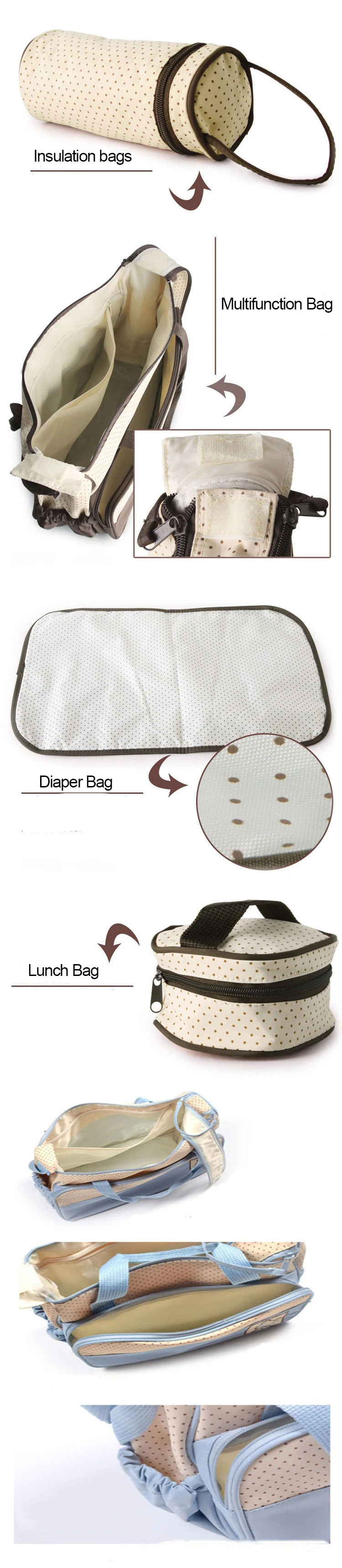 1. Портативный для путешествий 2. Большая емкость, ваш хороший помощник 3. Мульти использование, плечи, ручная переноска, одно плечо, через плечо Посылка список 1 x Биг-бэг 1 x средняя школа сумка 1 x пеленальная подстилка 1 х мешок для бутылки молока 1 x Упаковка для пищевых продуктов
