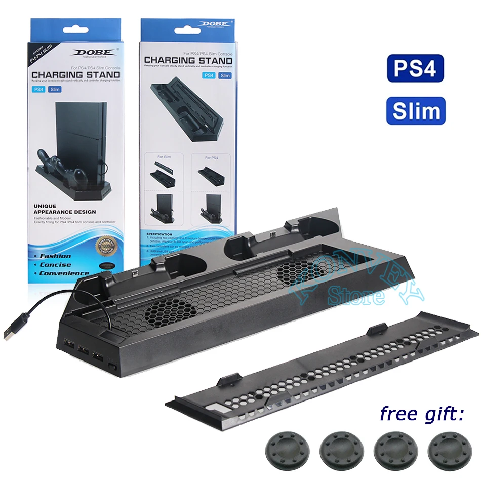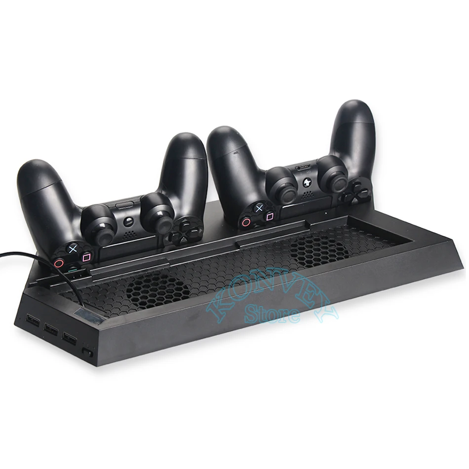 Уникальный дизайн внешнего вида, модный и классный; Точно подходит для PS4/ PS4 slim консоли и контроллеров; Охлаждающий вентилятор для PS4 slim console, 2 встроенных вентилятора для рассеивания тепла с вашей консоли, улучшения срока службы; Два контроллера можно заряжать одновременно, простое управление; Расширьте usb-порты, удобно для подключения большего количества usb-устройств; Дополнительный источник питания не требуется. Особенности Цвет: черный Вес изделия: 0,482 кг Материал: Пластик Входное напряжение: 500 мАч Входной ток: 5 В постоянного тока Скорость вентилятора: 3000 об/мин Ток вентилятора: 230 мАч Посылка включает в себя: 1 x Подставка для зарядки PS4/SLIM 4 силиконовых крышки (Бесплатный подарок).