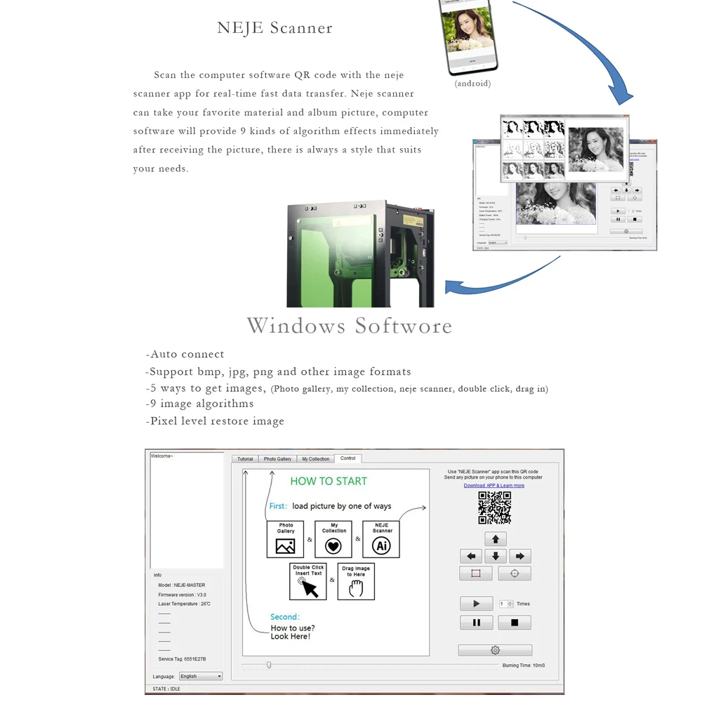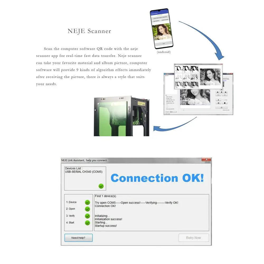 Сканируйте qr-код с помощью приложения NEJE Scanner (только поддержка версии Android), он автоматически подключается к компьютерному программному обеспечению, прост и прост в использовании.