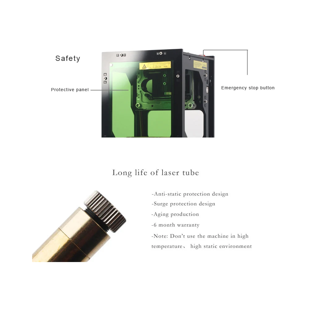 Оснащен 405нм лазерной трубкой, высокомощным лазером, более прочным, безопасным и гравированным глубже.