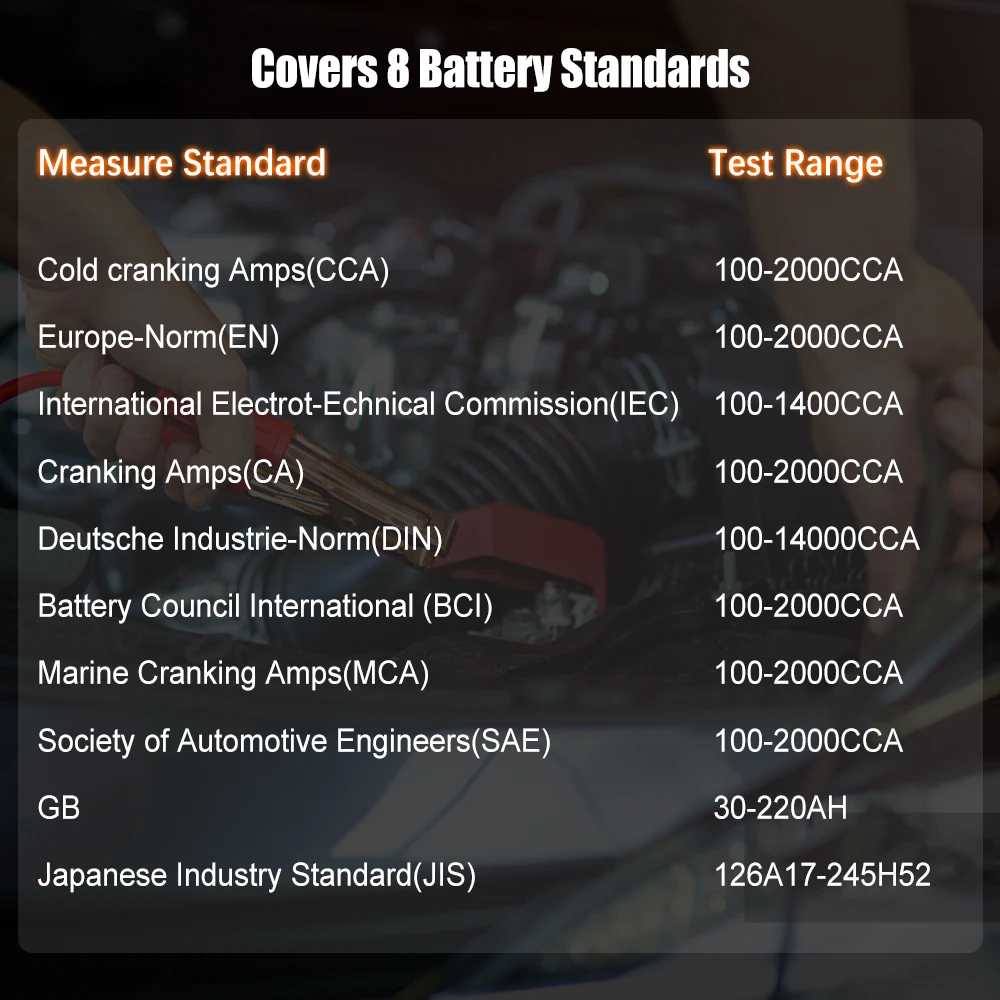 9. Стандарты тестирования включают в себя в настоящее время большинство в мире стандартов батареи, CCA, BCI, CA, MCA, JIS, DIN, IEC, EN, SAE, GB.