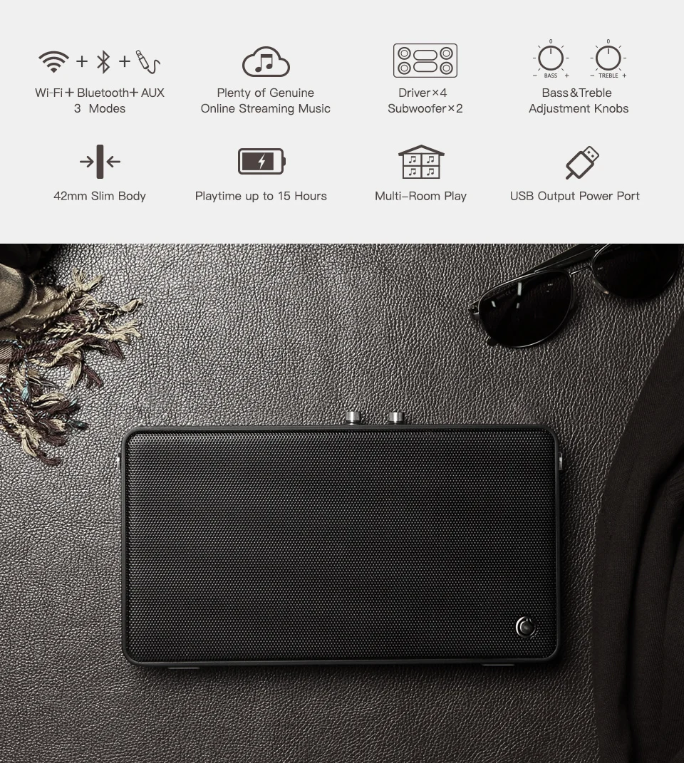 -20 Вт Мощный стереозвук -Время воспроизведения: Bluetooth (15 ч); WiFi (5 ч) -Поддержка голосового сервиса Alexa -Поддержка: AirPlay, DLNA,Spotify, Alexa, TuneIn, Pandora, iHeartRadio, TIDAL и т. Д. Также поддерживает любое музыкальное приложение, которое имеет функции DLNA/AirPlay, такие как Yandex, Hares, VK, Google music, Deezer, Shazam, zaycev, YouTube, Grade и так далее. -Двойная награда: IF Product Design award и Reddot Desigh Award Winner -Многокомнатная игра: воспроизведение 2 или более динамиков серии E одновременно -Настройка и предустановка любимых каналов -Регулируемое управление басами и высокими частотами -Поддержка: маршрутизатор 2,4 ГГц (не поддерживает 5 ГГц)