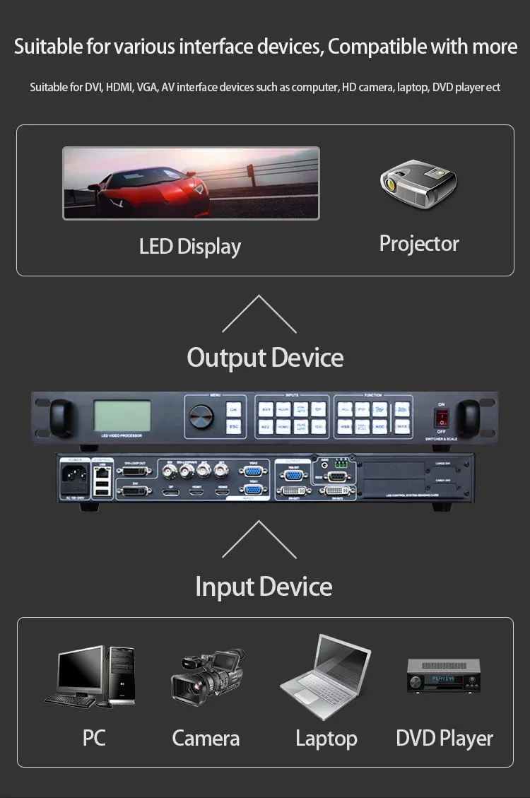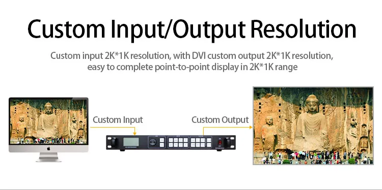 Плавно Переключайте любой канал ► 8 / 9-канал аналогово-цифровой видео Вход 1 DP, 1 HDMI, DVI, 2HDMI 、 2 VGA 、 2 AV 、 1SDI Функция обнаружения сигнала ● Поддержка аудиовыхода > Поддержка большого соединения 10x10 ● Поддержка пользовательского разрешения на выходе 2304x1152 @ 60 Гц, 2560x816 @ 60 Гц, 3840x640 @ 60 Гц Технология предварительного переключения ⑤ 34 показывает эффект произвольного переключения → Режим сохранения и отзыва Черный экран и замораживание с одной клавишей ⑤ Настройки регулировки ручки ►Поддержка управления интерфейсом RS232 > DVI-Loop Out удобный для многосплайсинга