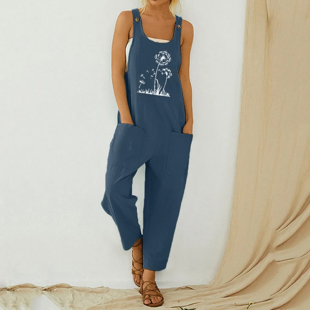 Для женщин Повседневное в богемном стиле с карманами и принтом Ползунки с длинным ремешком комбинезон с пуговицами