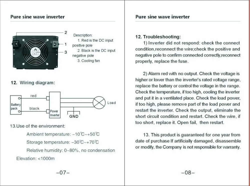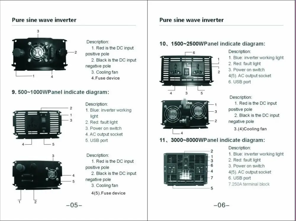 Синий световой светильник (выход инвертора, нормальная работа); Красный индикатор мигает (под/над напряжением, перегрузкой, температурой, коротким замыканием)