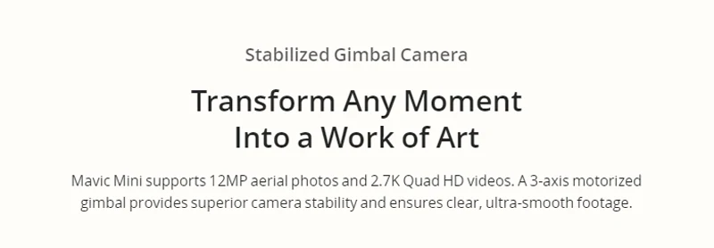 Mavic Mini поддерживает 12 МП аэрофотоснимков и 2,7 K Quad HD видео. 3-осевой моторизованный карданный вал обеспечивает превосходную стабильность камеры и обеспечивает четкую, ультра-гладкую съемку.