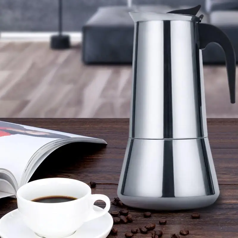 Эта Кофеварка из нержавеющей стали с пластиковой ручкой, которая удобно лежит в руке.