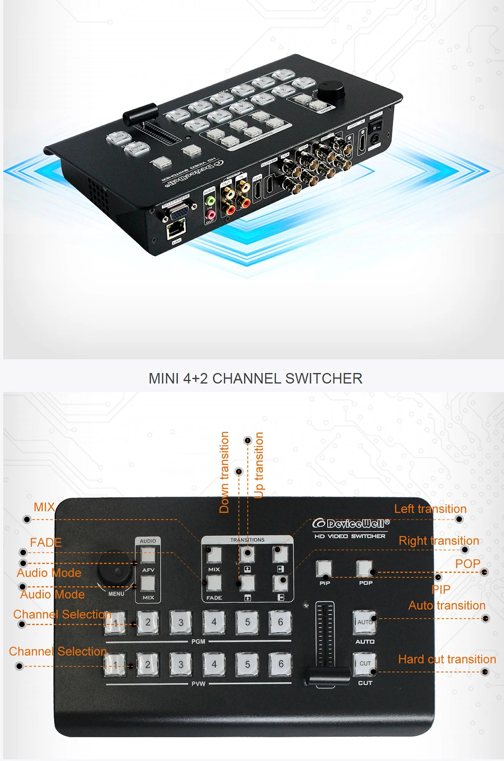 Портативный дизайн «Все в одном» Усовершенствованный черный металлический корпус, высокая прочность и вес светильник Интегрированная клавиатура управления Поддерживает до 4 SDI и 2 HDMI-совместимых входа 3,5 мм аналоговый аудио вход и выход 1-канальный RCA аудио вход и выход Поддержка PIP/поп-экрана Функция winduing Выход PGM: 2-канальный SDI и 1-канальный HDMI-совместимый Многоэкранный выход: 1-CH HDMI и 1-CH SDI Поддержка переключения спецэффектов, таких как микс/выцветание Поддержка 1 канала SDI выход на заказ PGM/PVW Поддержка резки жесткой поддержки для автоматического переключения Поддержка дистанционного управления Tally/network Внутренний модуль связи принимает промышленного класса CAN АВТОБУС Встроенная система контроля температуры шасси и вентилятора Поддержка онлайн обновления программного обеспечения