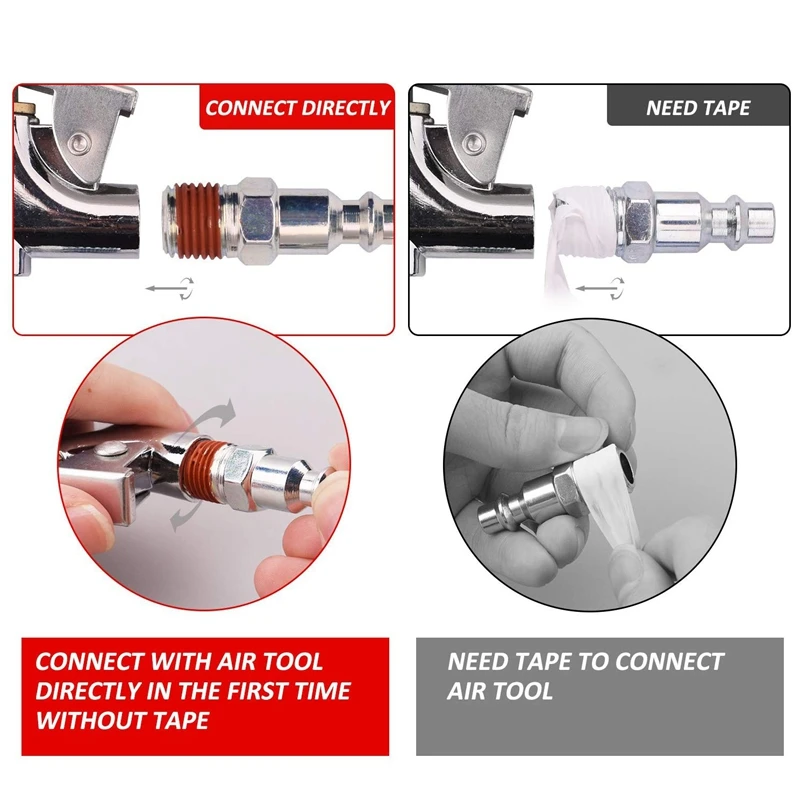 20 Piece Air Compressor Accessory Kit is a great air compressor kit with all you need to start your projects, including heavy duty dual tire chuck for tire inflation and pencil tire gauge ensures tire properly inflated, also the tire inflation needles/nozzles to inflate pool toys, sports balls and air mattresses. It has all the most commonly used air compressor accessory items in one set. All the outside thread with sealant, which is much better for sealing.