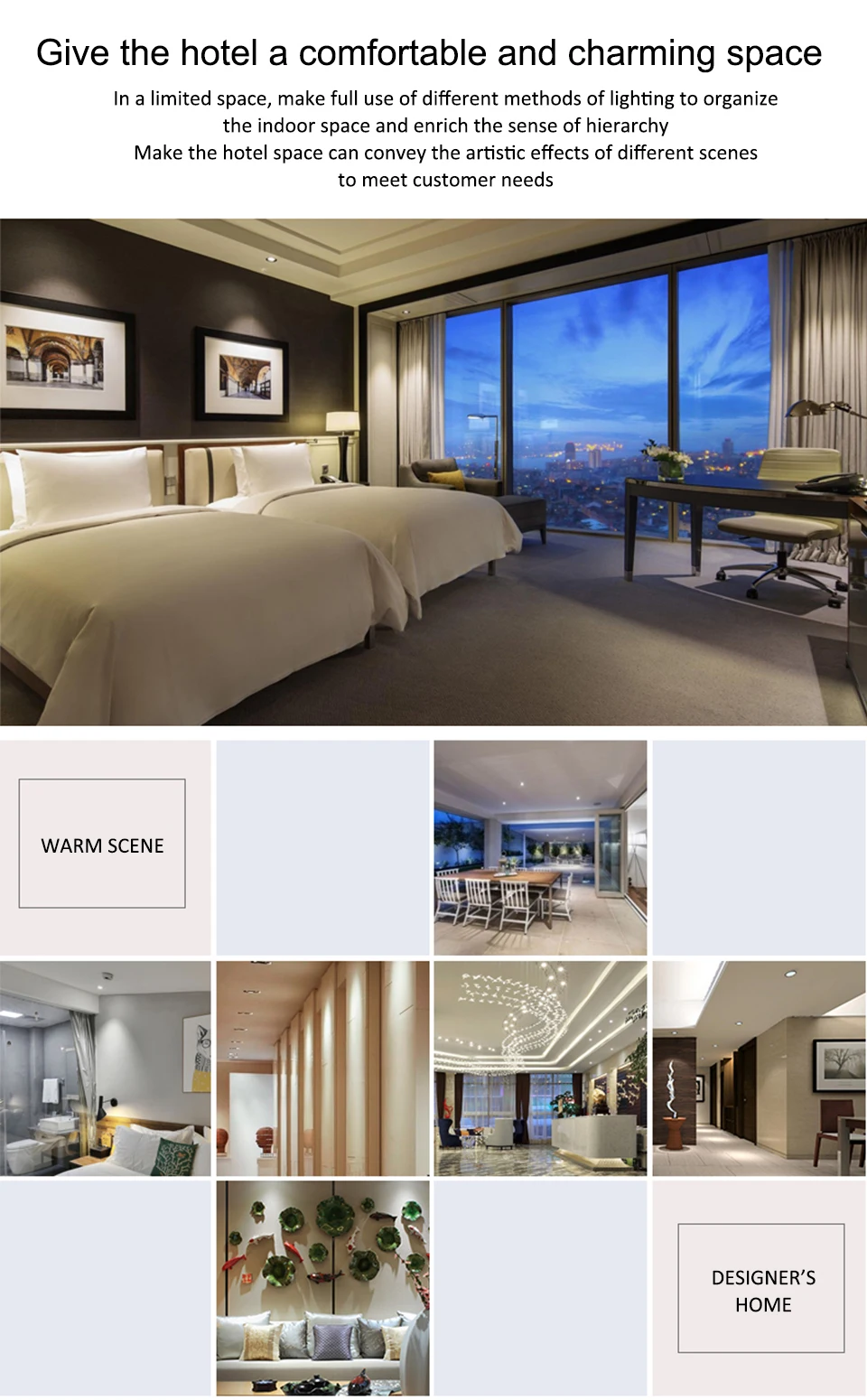 В ограниченном пространстве, в полной мере использовать различные методы освещения для организации внутреннего пространства и обогатить чувство подчиненности. Пространство отеля может передавать художественные эффекты различных сцен для удовлетворения потребностей клиентов.