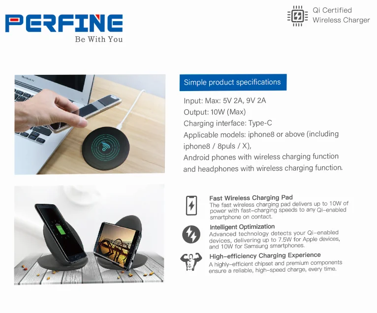 -Ультратонкий дизайн корпуса. Поддерживает два режима зарядки, режим укладки и стояния. Прост в использовании. -Противоскользящий резиновый круг и основание предотвращают скольжение устройства во время зарядки. --Складное индукционное зарядное устройство: беспроводное зарядное устройство может быть отрегулировано (<90 °), что позволяет нашему мобильному телефону стабильно размещаться. Он может быть помещен с планшета на подставку, что гораздо более удобно для различных целей, мы могли бы иметь фильм, вызов, список музыки, чтение электронной книги и так далее. -Быстрая зарядка: наше Быстрое беспроводное зарядное устройство может заряжать в 1,5 раза быстрее, чем обычные. (Пожалуйста, проверьте инструкцию вашего телефона, где вы можете найти, сколько ватт Беспроводное зарядное устройство должно быть необходимо для вашего телефона, и пожалуйста, используйте адаптер 18 Вт (9V 2A или 12V 1.5A), В противном случае мы не можем быстро зарядить наш телефон должным образом). --Светильник: светодиодный светильник Perfine разработан уникальный, он разработан как ночной Светильник в спальне, удобный для ухода за ребенком или вставать в ночное время. Вход: USB - Type C 5V--2A, 9V--2A (макс.) Выход: 5Wh, 7.5Wh, 10Wh (макс.). Вспомогательное оборудование: Xiaomi 9, 9pro, XiaoMi 10, 10pro и другие продукты серии беспроводной зарядки Redmi. Iphone 8 или abave(Iphone 8, 8 Plus, Iphone X и т. д.), Samsung Galaxy S7 S8 S9 S10 Note 5 и т. Д. LG V30 G8 ThinQ... Наушники и другие устройства с функцией беспроводной зарядки. Простая установка: Нам просто нужно подключить usb-кабель (предоставляется в посылка) и беспроводное зарядное устройство. После того, как катушка почувствует, она начинает заряжать, и индикатор питания мигает каждые 3-4 секунды. Когда телефон полностью заряжен, индикатор питания всегда включен, и когда Huawei, Apple series, Apple AirPods с чехлом для беспроводной зарядки полностью заряжается, беспроводное зарядное устройство Perfine автоматически уменьшит до самой низкой выходной мощности, так что оно не заставит наш телефон перегреваться и защищать наш телефон. Очень практично в офисе, в спальне и т. Д.