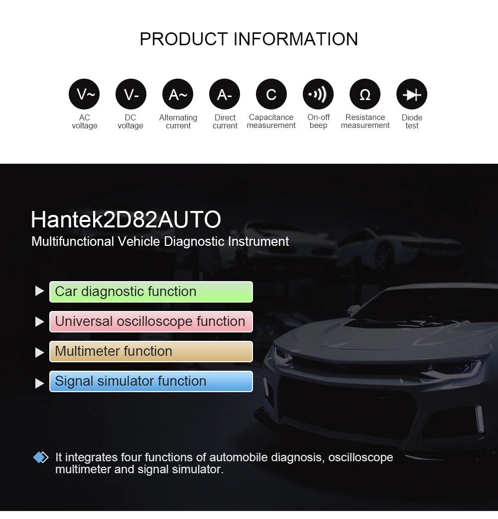 Совершенно новая портативная серия oscilloscope-Hantek2000, она продолжает компактную и легкую концепцию, но с многофункциональным тестером 4 в 1 нового поколения: Автомобильная диагностика, осциллограф, источник сигнала и мультиметр; небольшой объем некоммерческого захвата одной рукой; Подвесная подставка была разработана для поддержки регулировки нескольких углов; Ультра-низкая мощность, Интерфейс зарядки типа C, каждый 2 часа заряда батареи позволяет работать один полный день или в режиме ожидания два месяца; Цветной ЖК-дисплей высокой четкости четкий и деликатный; Минималистичный дизайн клавиатуры упрощает работу, прост в использовании.