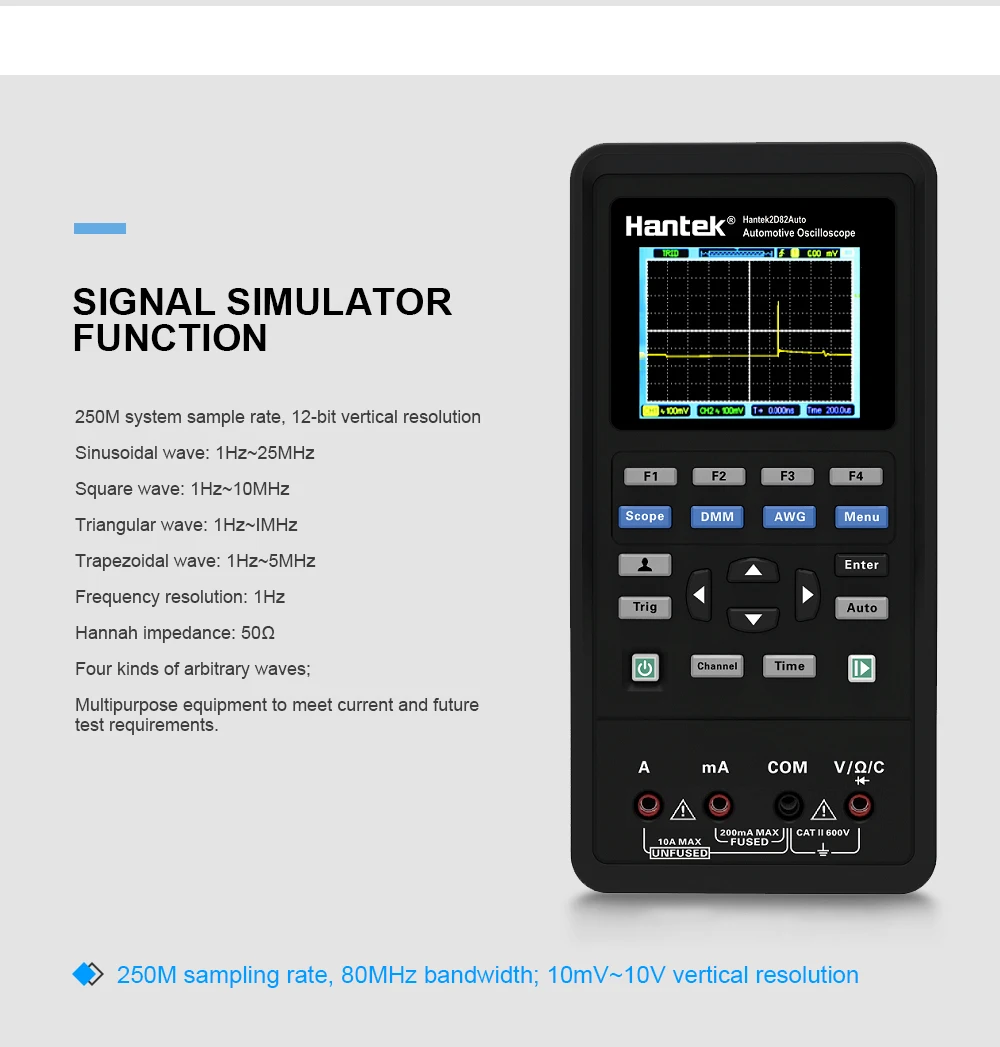 ● Осциллограф: 2 канала осциллографа, 80 МГц полоса пропускания, 250 м частота дискретизации.