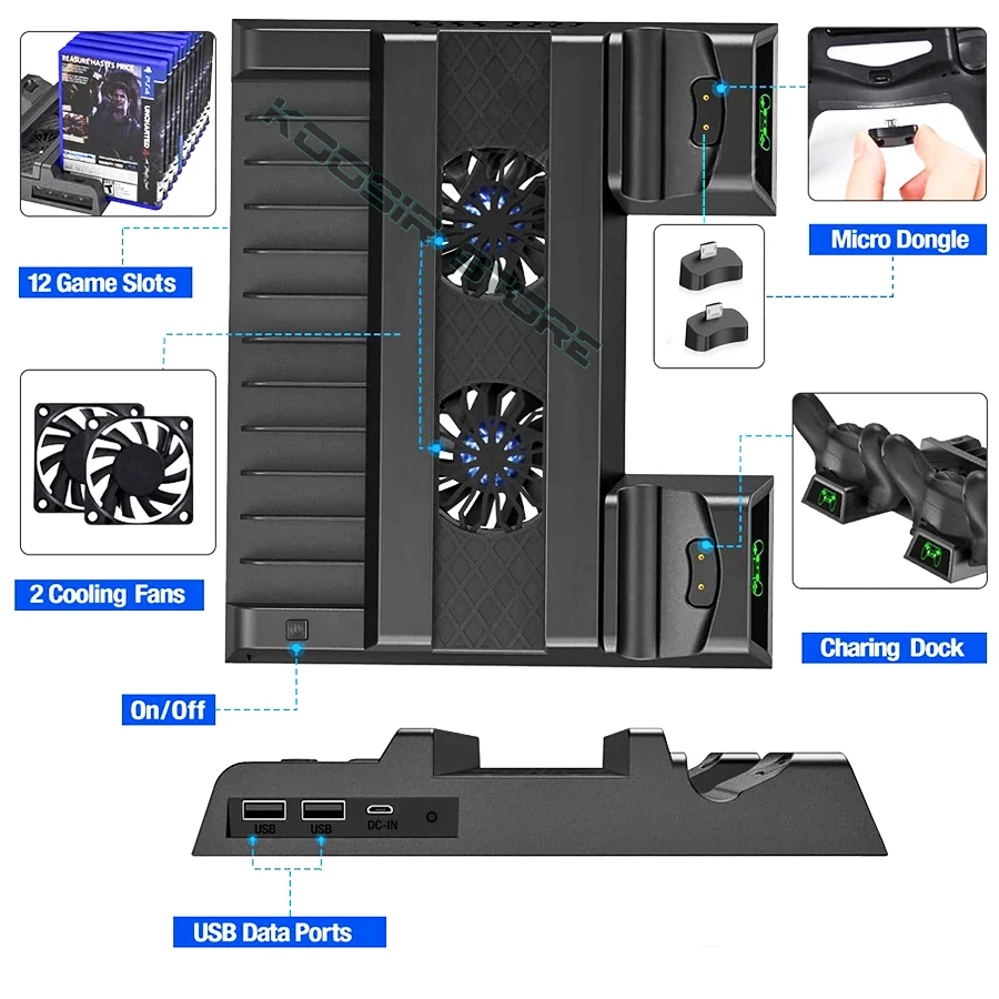 Этот продукт предназначен для снижения температуры консоли PS4 Slim и для зарядки контроллера PS4, а также может работать в качестве подставки для консоли. Этот продукт может эффективно снизить температуру консоли PS4 Slim, улучшить ее производительность и снизить потери мощности. Выключается, когда переключатель отскакивает, и включается при нажатии вниз, он может ускорить воздух внутри консоли, чтобы избежать высоких температур, уменьшите потери мощности и Продлите срок службы консоли. Для зарядки оригинального контроллера PS4 на правой стороне есть два дока, контроллер будет заряжаться при подключении его к докам. Это тот же способ зарядки, что и оригинальный, чтобы продлить срок службы контроллера. На левой стороне можно хранить 12 игровых дисков. Совместим с консолью PS4 Slim.