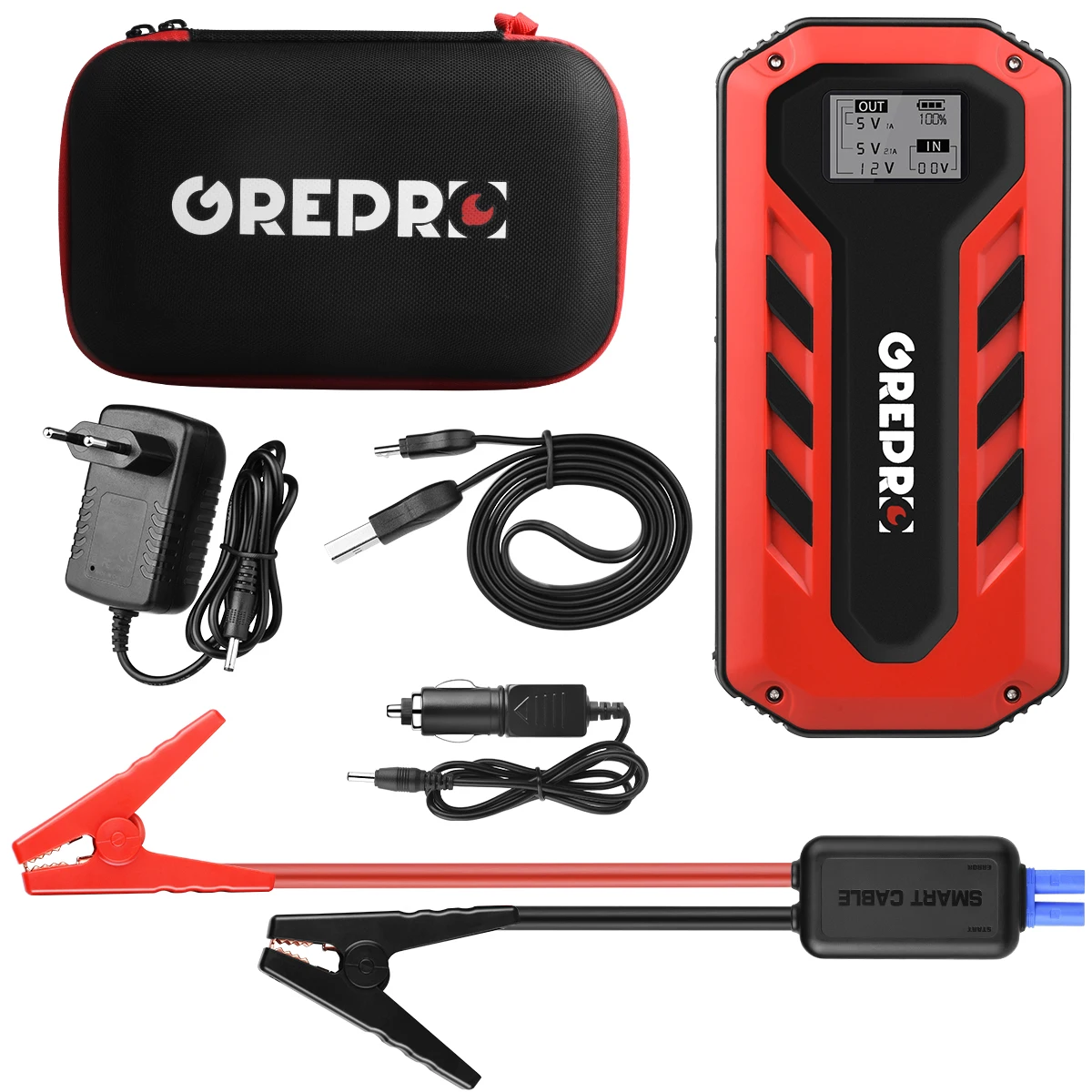 1 х пусковое устройство 1 х Портативная сумка 1 зарядное устройство 1 х умный соединительный кабель Автомобильное зарядное устройство-1 шт. 1 х USB кабель 1 x Руководство пользователя