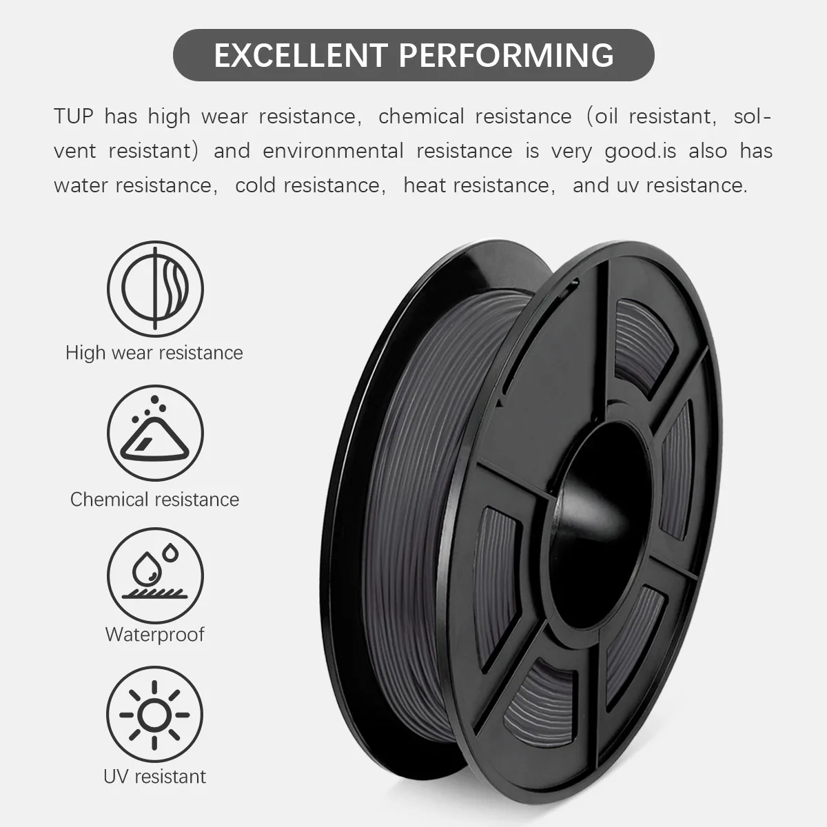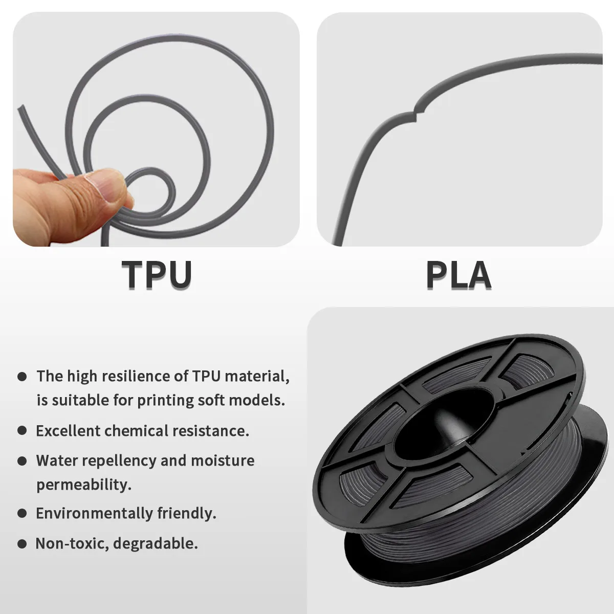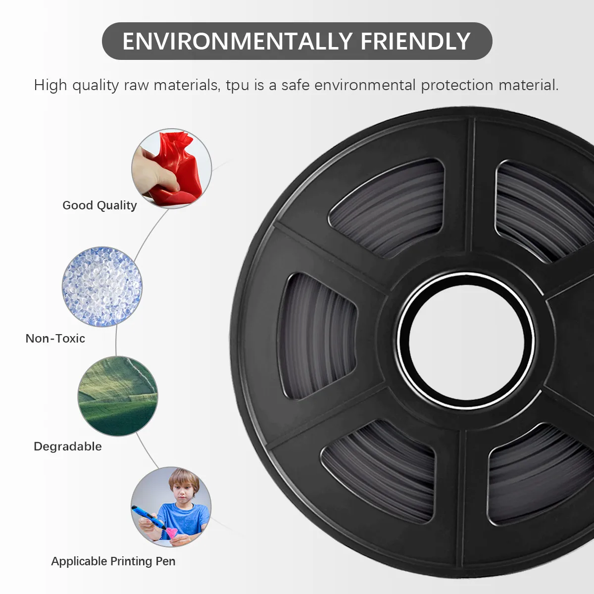 Гибкая нить из ТПУ не токсична, легко питается, легко формируется, обладает высокой прочностью и эластичностью. Хорошо для печати детских игрушек и обуви и т. Д.