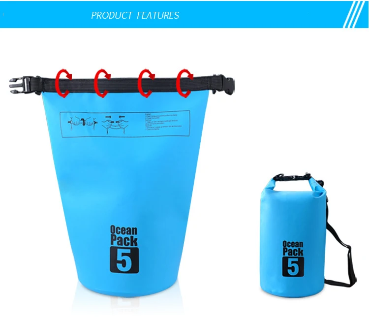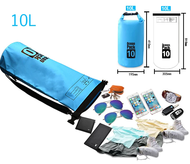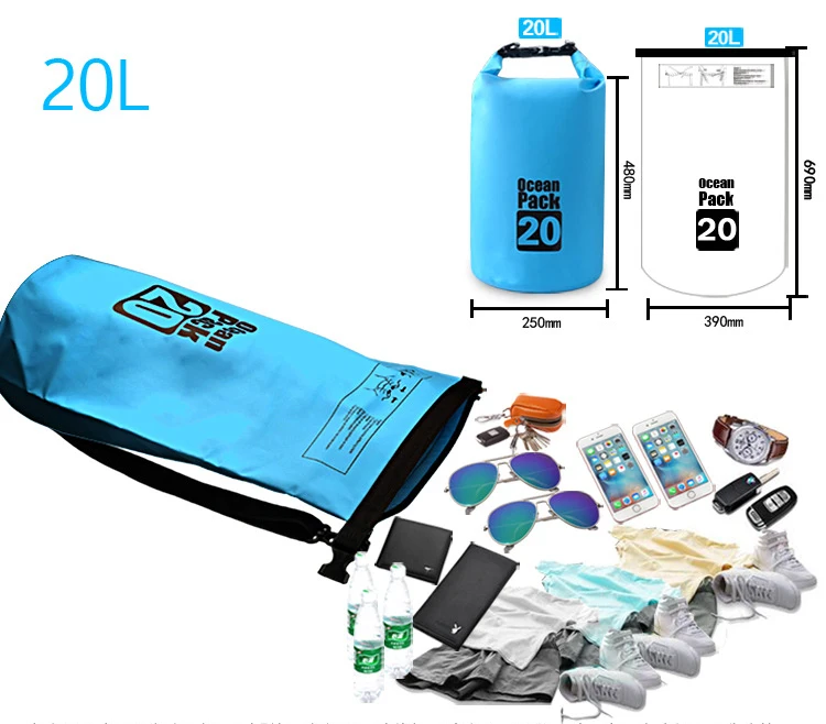 1.Material: PVC clamping net 2.Waterproof Index: ≥ 5000 3.Color: 7 Colours(If you need other colors, you can make notes or contact customer service when you place an order) 4.Capacity: 2L/3L/5L/10L/15L/20L/30L Size Diameter Height Weight Baldric 2L 110mm 220mm 85g no 3L 150mm 220mm 160g single 5L 195mm 320mm 235g single 10L 195mm 410mm 275g single 15L 210mm 430mm 300g single 20L 250mm 480mm 400g double 30L 250mm 540mm 445g double Features: 1.Suitable for quick submersion 2.Soft and flexible for easy storage 3.Multi-purpose storage application 4.Suitable for camping, drifting, hiking and other outdoor activities 5.Durable, wipe clean and easy to store away 6.Protects your valuables from dirt, dust, sand and water 7.Made of high performance waterproof fabric and fully seam sealed 8.Its roll-top closure locks out all moisture and makes the bag air tight 9.Humanized design, it can be used as lifebelt in emergency 10.It can put food, clothes, wallet and other personal belongings 11.It can be compressed, it is convenient to carry.