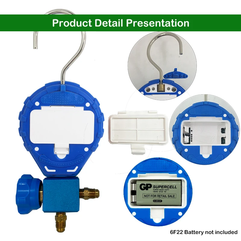 1. Может измерять часто используемый газ, жидкость. 2. Можно измерить вакуум. 3. Содержит датчики давления и температуры для общих хладагентов. 4.LCD с подсветкой. 5. Длительный срок службы батареи, отсутствие энергопотребления после отключения. 6. Возможны измерения: R12, R22, R32, R123, R134, R290, R404, R407, R410, R502, R507, R600. 7. Единицы измерения давления можно выбрать из МПа, кПа, бар, psi, кгс/см2, мм рт. Ст., inHg, Torr