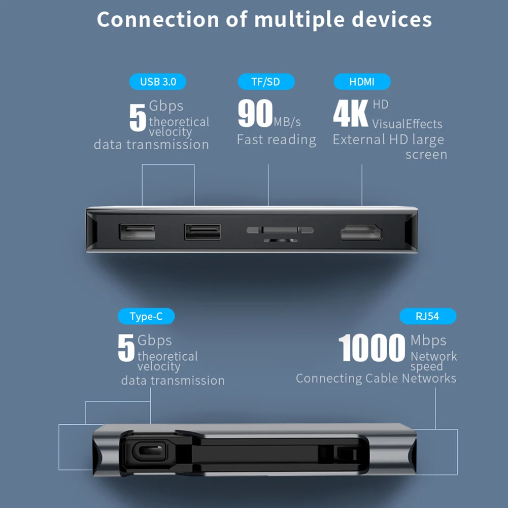 7 в 1: USB3.0 * 2 + SD * 1 + TF * 1 + HDMI * 1 + RJ45 * 1 + PD * 1