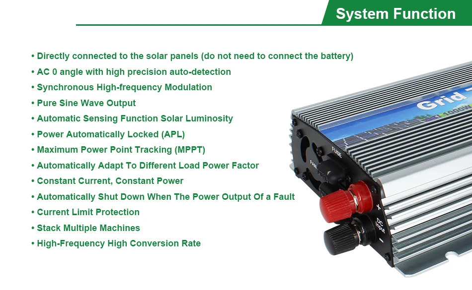 Используя точные функции MPPT, функции APL, инвертор автоматически регулирует панели солнечных батарей с максимальной выходной мощностью, просто подключите панель солнечных батарей к инверторам сетки. Не нужно подключать батарею.