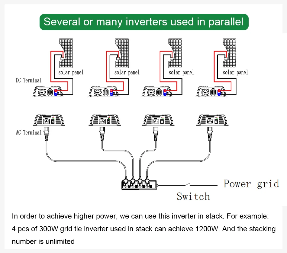 Рекомендуется использовать несколько солнечных батарей. Солнечная панель в серии приведет к высокому входному напряжению, которое будет превышать диапазон рабочего напряжения инвертора.