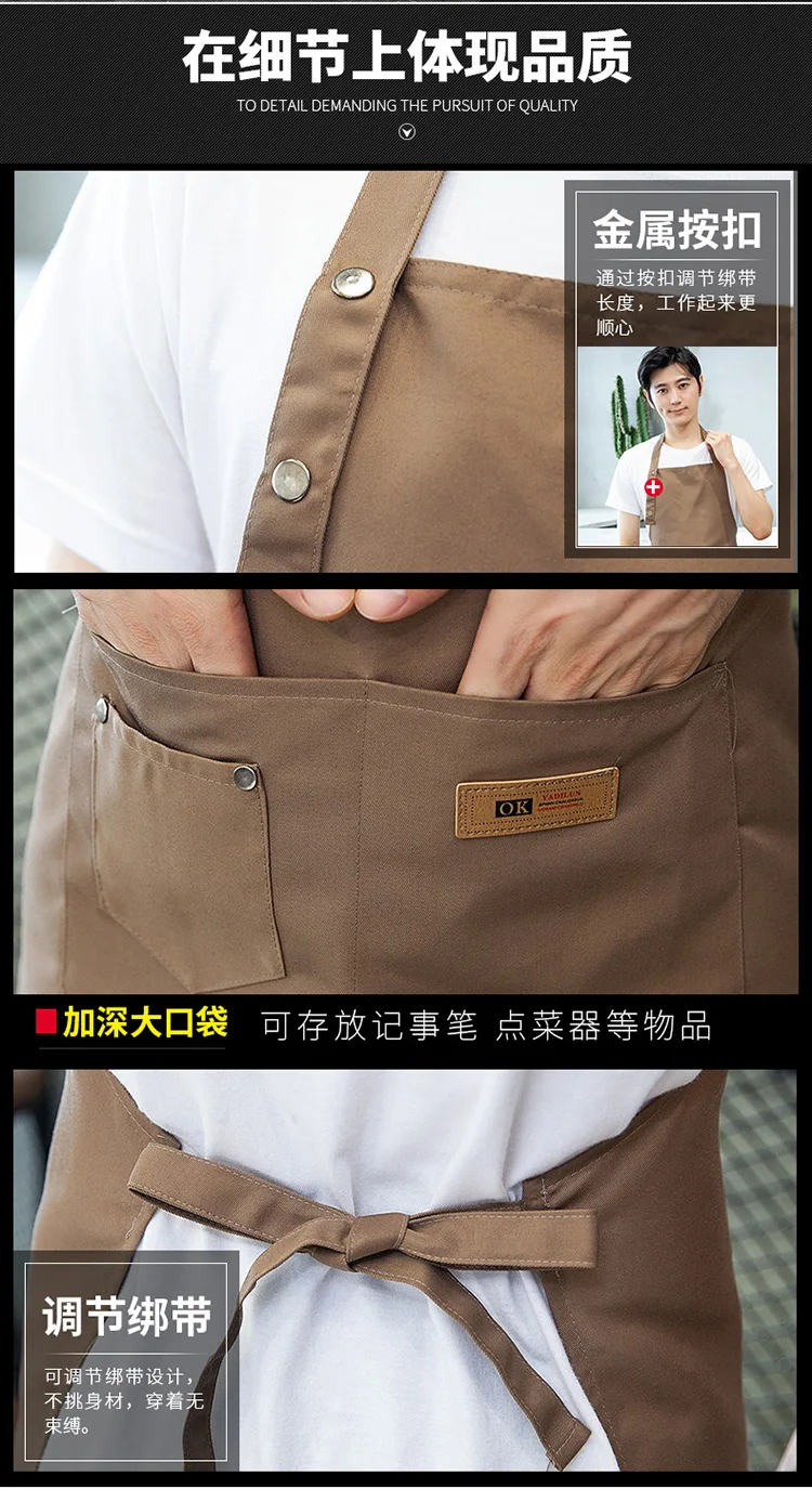 Новый модный кухонный фартук для женщин, мужчин, шеф-повара, официанта, кафе, магазин, барбекю, парикмахерские фартуки, индивидуальный логотип, подарочные нагрудники, оптовая продажа Особенности: * 1. Два больших кармана для легкой загрузки мелких предметов. * 2. Регулируемый слюнявчик для людей с разной высотой. * 3. Высокая Плотность обеспечивает водонепроницаемость. * 4. Гальванические пуговицы приносят некоторые украшения в однотонный фартук. * 5. Тонкое мастерство и строчка, прочные и износостойкие. Описание: * 1. Материал: хлопок * 2. Функция: Устойчивый к пятнам Упаковочный лист: фартук * 1