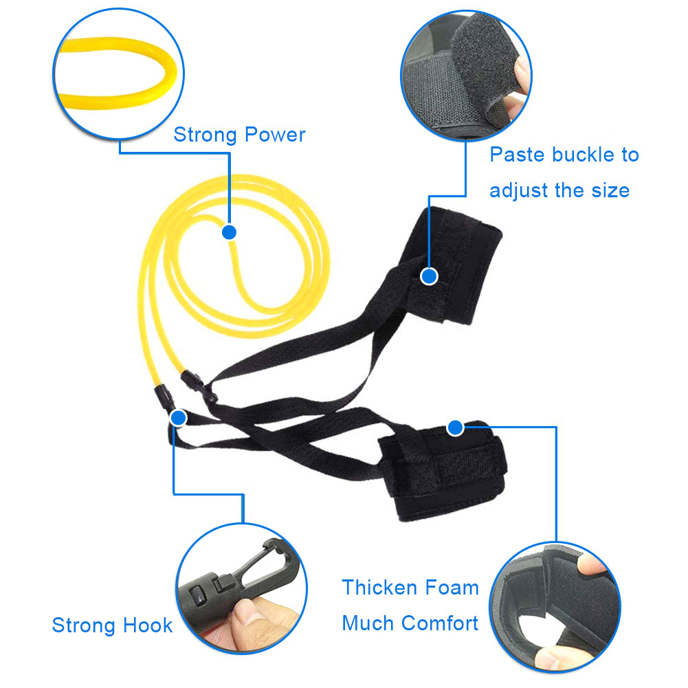 -Фиксированный ремешок для лодыжки пловца поставляется в комплекте из трех предметов, по одному на каждую лодыжку, а растягивающийся эластичный канат крепится на одну лодыжку, которые могут обернуть вокруг якоря, а затем на другую лодыжку.