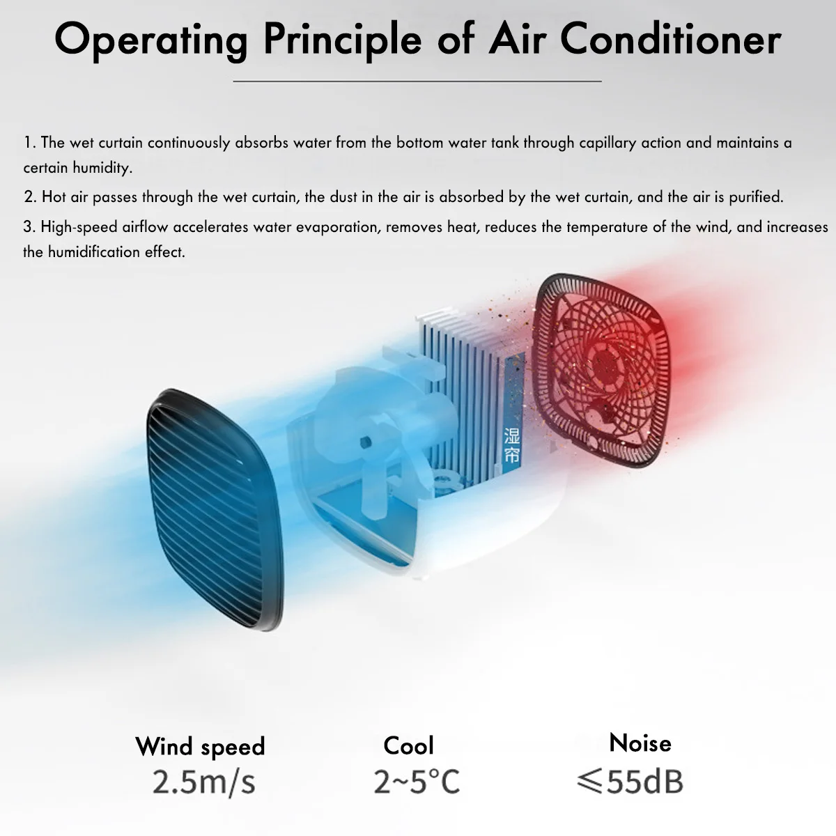 ◆Принцип вентилятора кондиционера заключается в том, что вода в резервуаре для воды прокачивается до ледяного занавеса через водяной насос, и воздух дует прохладнее после того, как ледяная занавеска остывает вниз.