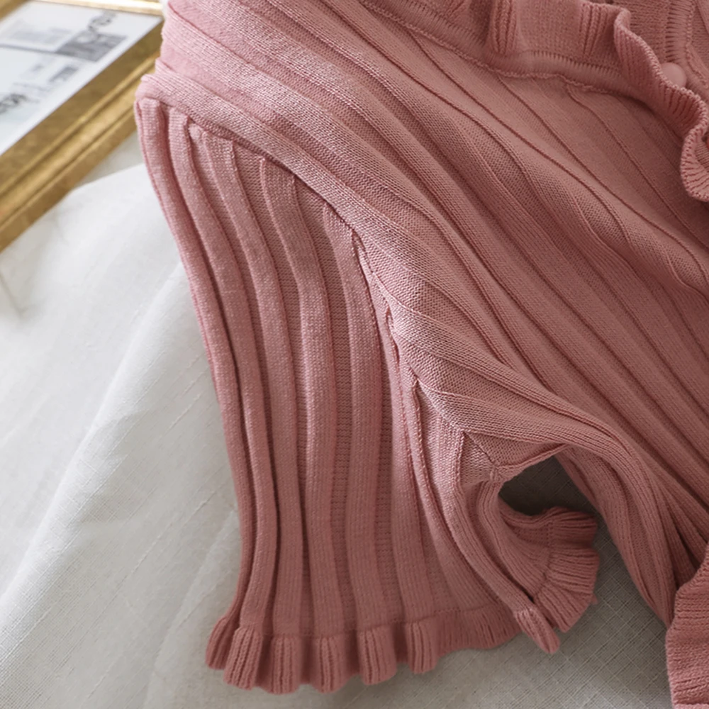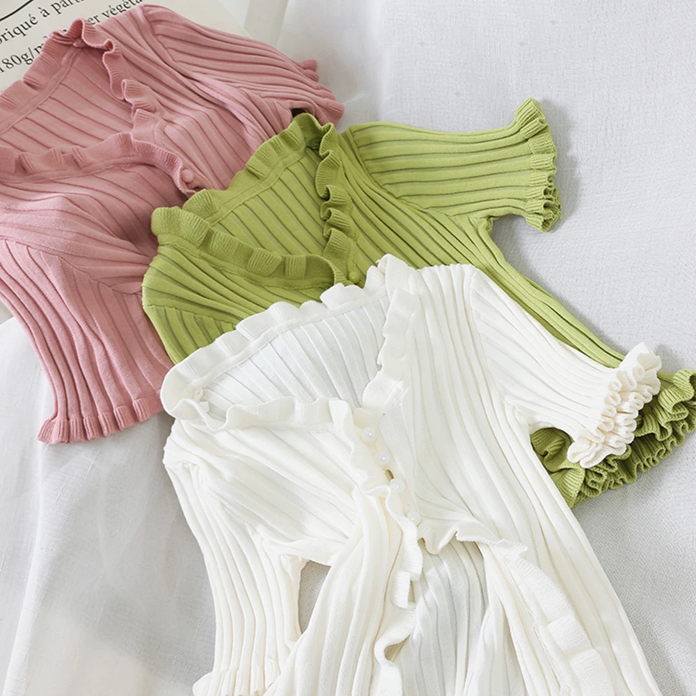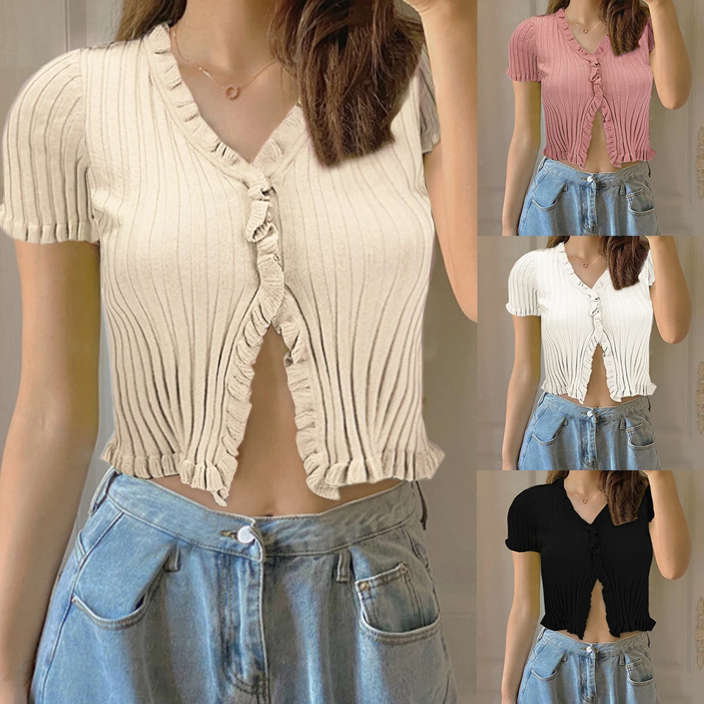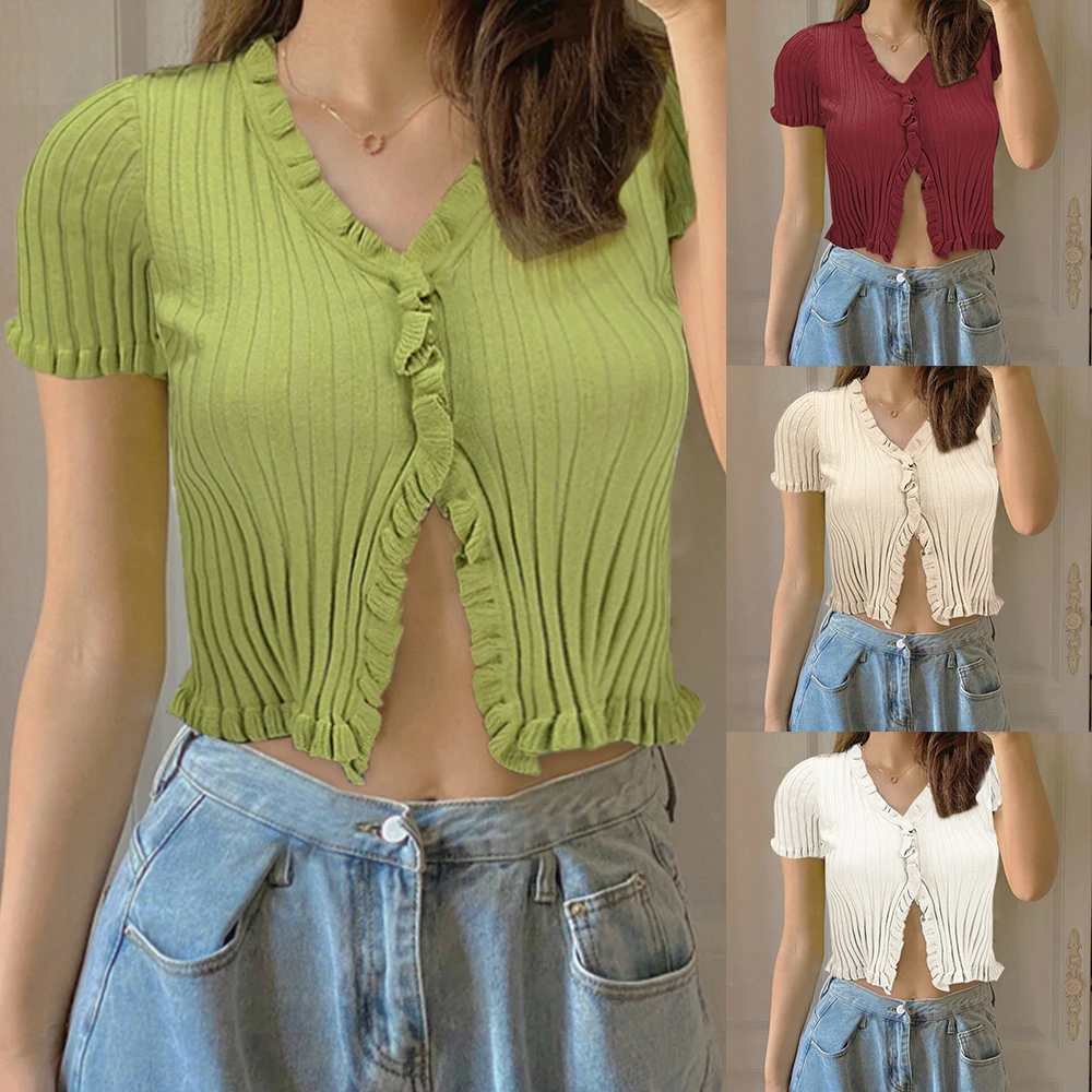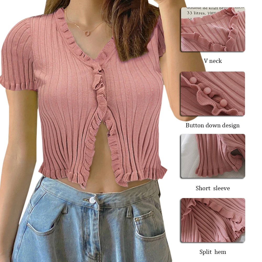 Характеристики: это летнее женское привлекательное пальто с пуговицами и низким вырезом, дизайн с оборками в стиле ретро, вязаные короткие рукава, чтобы вы были холодны летом.