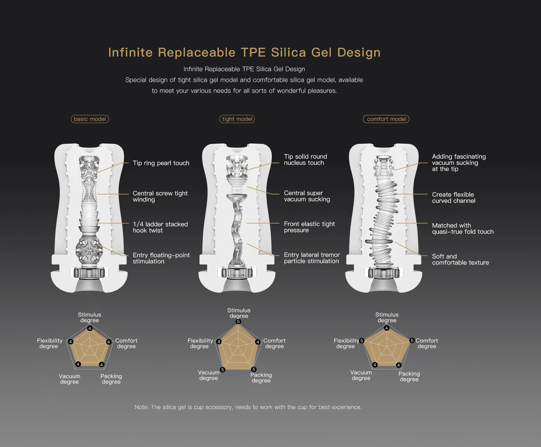 Наши воздушные чашки поставляются с базовой версией встроенного силикона, и вы можете попробовать различные впечатления, купив наши другие встроенные силиконы.