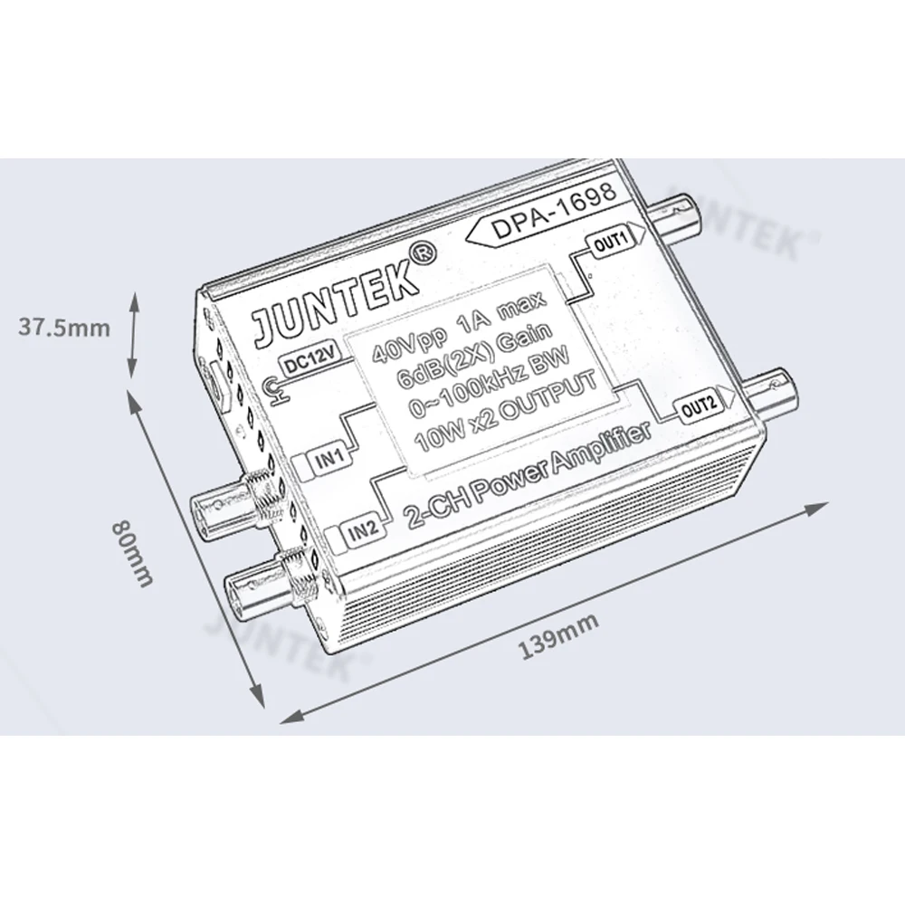 DPA-1698 двухканальный усилитель сигнала мощности. DPA-1698 двухканальный усилитель сигнала мощности изготовлен из высокопрочного алюминиевого сплава, который является прочным и легко рассеивать тепло. 2 раза Амплитуда входного сигнала, одноканальный ток может достигать 1 А, частотный диапазон 0-100 кГц .. он также очень подходит для использования в учебном оборудовании, промышленном управлении, тестирование линии продукции, обнаружение металла, медицинская физиотерапия, медицинская красота, ультразвуковое оборудование вождения и другие области. Усилитель мощности очень прост и удобен в использовании. Блок питания принимает 12V5A адаптер питания, который очень безопасен. Входная частота синусоидальной волны 80 кГц, амплитуда 20Vpp. После усилителя мощности амплитуда сигнала усиливается в 2 раза до 40Vpp.