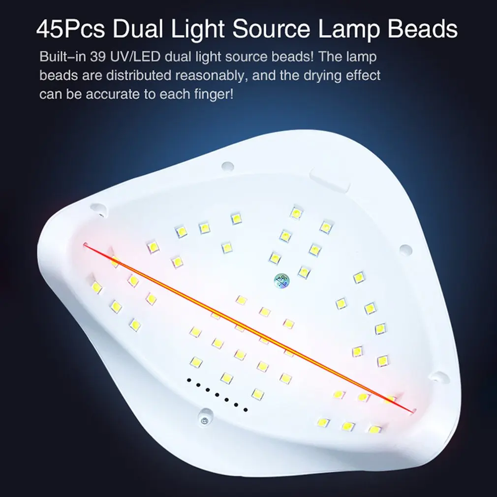 【 45 светодиодный светильник 】 лампа для ногтей работает, как только вы положите руку внутрь. Лампа автоматически включается, когда вы вставляете свою руку внутрь и автоматически выключается при его удалении. 45 ламповых бусин крепятся равномерно на лампу для ногтей, чтобы хорошо высушить ногти.