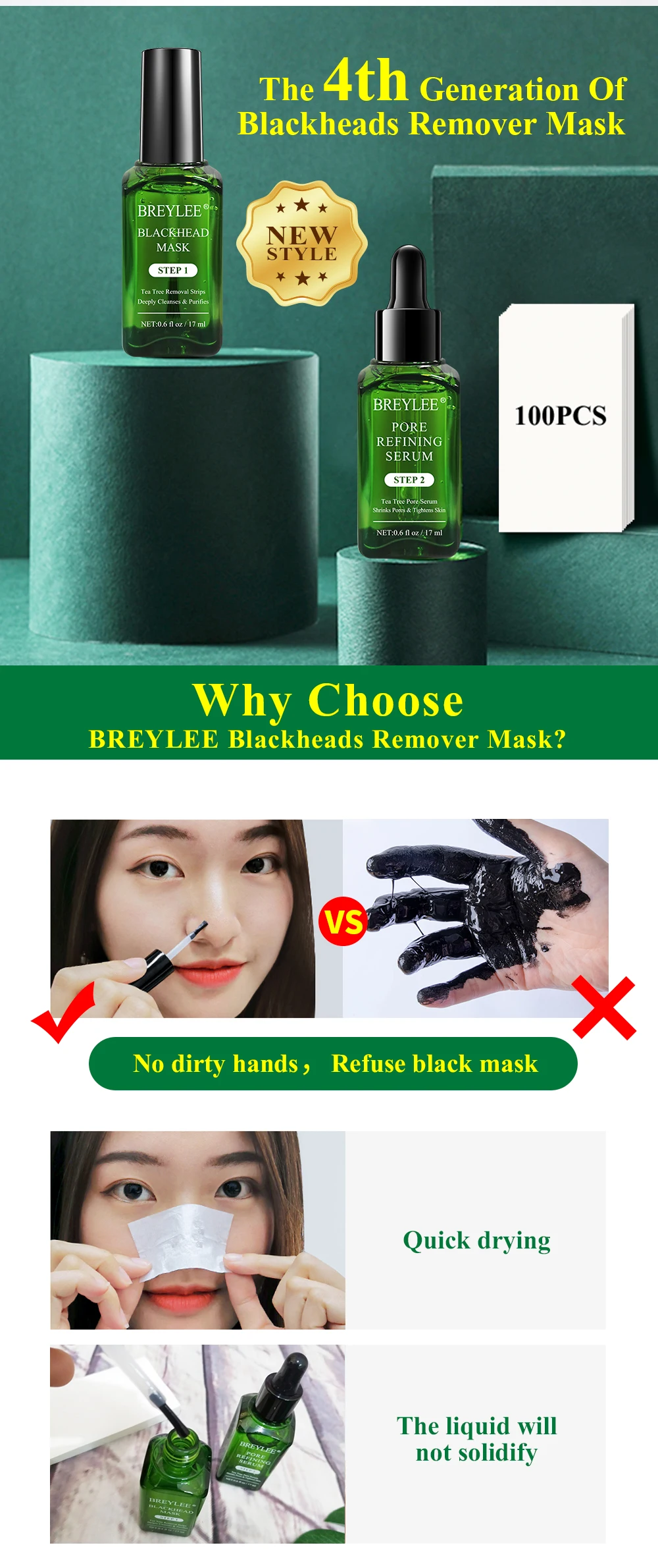 Маска для удаления угрей 4-го поколения Почему стоит выбрать маску для удаления черных точек BREYLEE? 1. Нет грязных рук, откажитесь от черной маски 2. Быстрая сушка 3. Жидкость не затвердевает