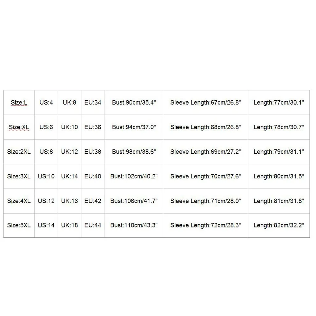 Размер США Великобритания ЕС Бюст Длина рукава Длина L 4 8 34 90 см/35,4" 67 см/26,8 дюйма 77 см/30,1'' XL 6 10 36 94 см/37,0" 68 см/26,8" 78 см/30,7'' 2XL 8 12 38 98 см/38,6" 69 см/27,2" 79 см/31,1'' 3XL 10 14 40 102 см/40,2" 70 см/27,6" 80 см/31,5'' 4XL 12 16 42 106 см/41,7" 71 см/28,0" 81 см/31,8'' 5XL 14 18 44 110 см/43,3" 72 см/28,3 дюйма 82 см/32,2''