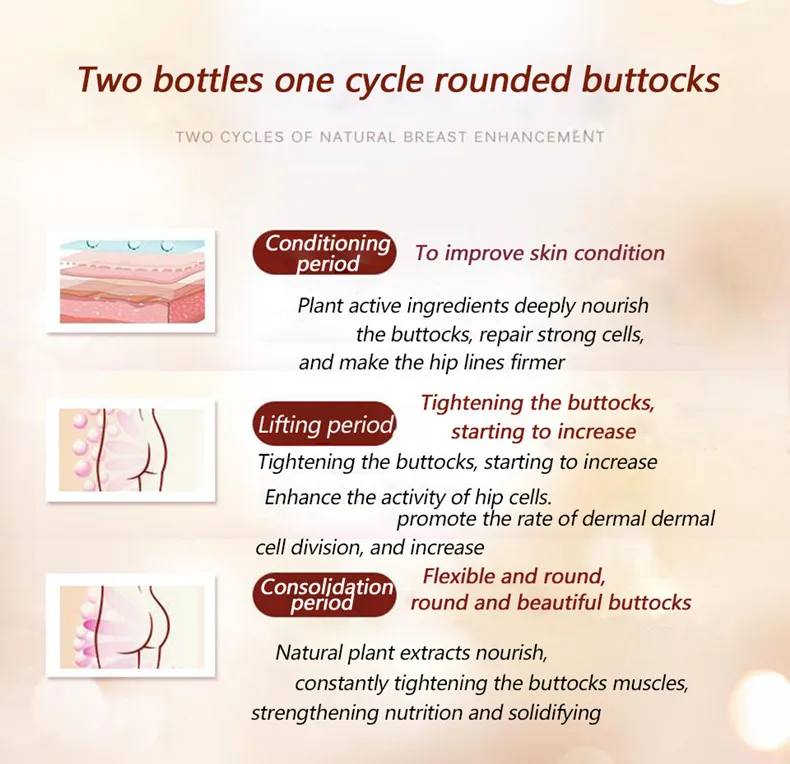 Warranty Period: 3 yearsMain Functions: Let the cells of the butt largely absorb mineral substance and microelement and comprehensively activate the resting cell and meridians and collaterals. It can be greatly penetrated into the deep tissue of the butt, accelerate the fat synthesis, promote the blood circulation and improve the loose skin, so as to create firm, plump and elastic butt.