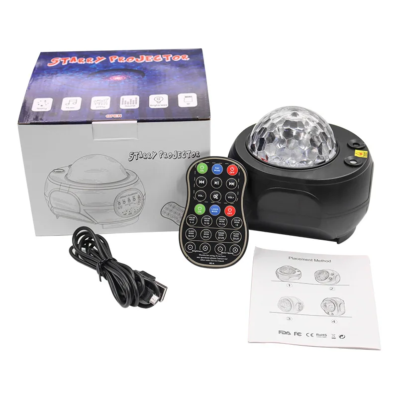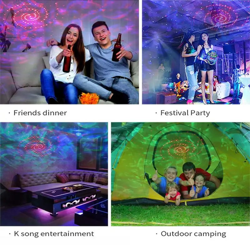 1. Описание продукта: Этот продукт представляет собой комбинацию четырехцветных водяных знаков и красно-зеленого лазера. Водяной знак имеет четыре цвета: красный, белый, синий и зеленый. Цвет лазера красно-зеленый. Пульт дистанционного управления может регулировать цвет водяных знаков и скорость водяных знаков. Режим водяных знаков, режим Bluetooth, одно управление водяными знаками, одно лазерное управление, яркость, управление музыкой, управление звуком, выбор режима, переключатель.