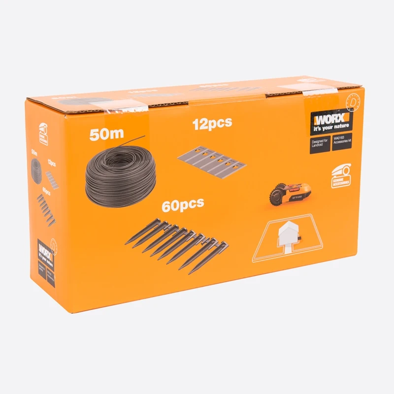 WORX WA0183 – универсальный комплект аксессуаров для роботизированных газонокосилок Landroid. Комплект включает в себя 12 сменных лезвий с крепежными винтами и принадлежности для монтажа: ограничительный провод длиной 50 метров и 70 кольев для его установки.