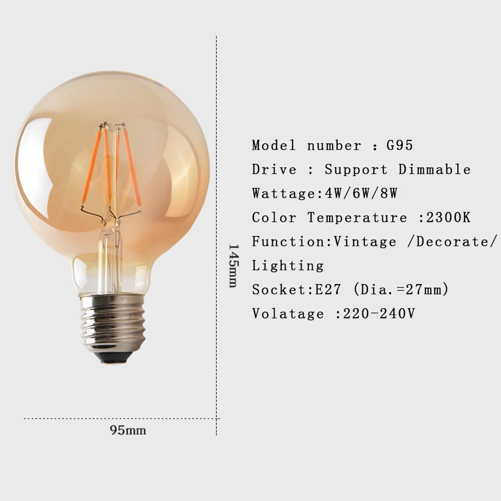 Диммируемая лампа G95 ST64, G125 E27 220 В, спиральная филаментная светодиодная лампа, Буль-б 4 Вт/6 Вт/8 Вт, Ретро Винтажные лампы, декоративный светильник